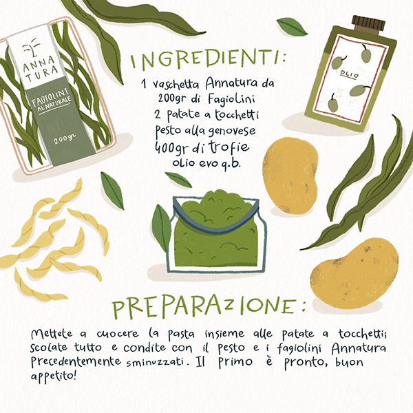 Per promuovere i fagiolini, Annatura utilizza quest’anno una ricetta tradizionale “Trofie al pesto, fagiolini e patate”. “La proposta di questa ricetta che utilizza i nostri fagiolini cotti – specifica Innocenzi - ha come obiettivo principale quello di mostrare i punti di forza del nostro prodotto: un ortaggio eccellente per qualità, genuinità e gusto, utilizzabile in qualunque ricettazione, dalle più complesse alle più semplici e veloci; un prodotto estremamente versatile che accorcia la preparazione di una caponata o dà gusto ad una semplice insalata”. E continua: “Tutto avviene sempre senza rinunciare a benessere e praticità e questo fa si che Annatura si rivolga un po’ a tutti: a chi non ha molto tempo a disposizione per cucinare, che sia un giovane lavoratore o una famiglia, o a chi voglia portarsi il cibo fuori casa per necessità lavorative o per una gita fuori porta”.
