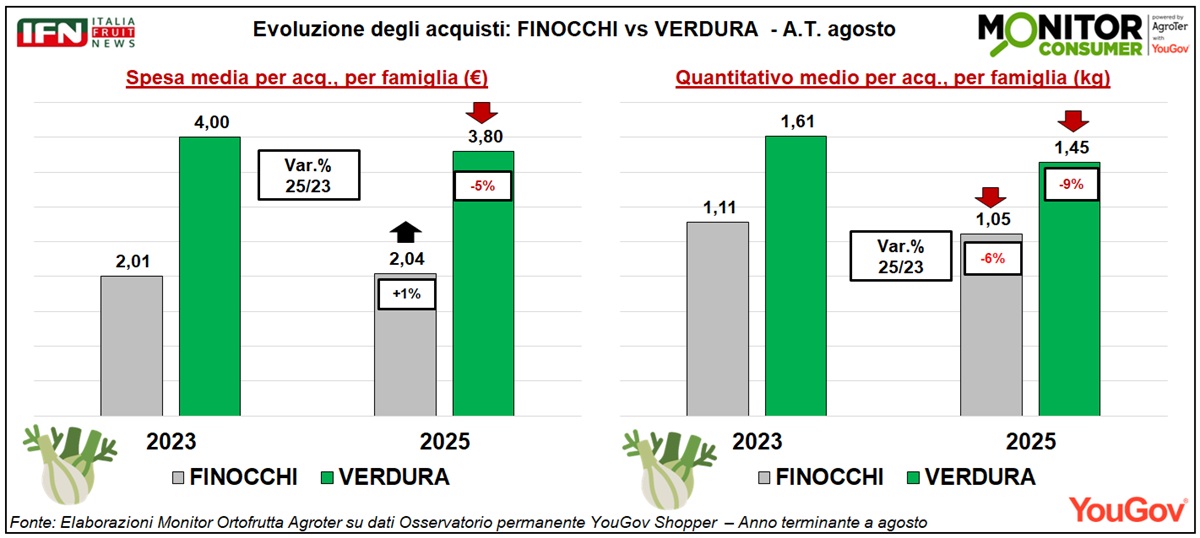 In termini di spesa media per atto di acquisto, i finocchi confermano i valori di due anni fa, registrando anzi un lieve aumento dell’1%, a differenza dell’intero comparto della verdura che mostra un calo del 5%. A diminuire è invece il quantitativo medio acquistato per singolo atto d'acquisto, una strategia con cui i consumatori cercano di mitigare l'incidenza sulla spesa globale. Per i finocchi la contrazione è del 6%, un dato comunque migliore rispetto a quello della verdura, dove il calo raggiunge il 9%.
