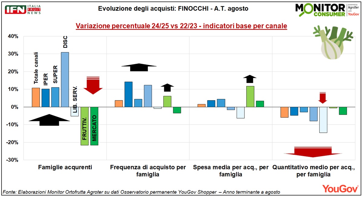 Gli indicatori relativi ai diversi canali di acquisto evidenziano il ruolo sempre più rilevante che la Gdo sta assumendo anche in questa categoria, come già osservato in molti altri comparti. Per i finocchi, i punti vendita della Gdo — esclusi i negozi di libero servizio più piccoli — e, soprattutto, i discount registrano una netta crescita sia della quota di famiglie acquirenti sia della frequenza di acquisto. Parallelamente, nei canali tradizionali, la penetrazione delle famiglie cala sensibilmente; tuttavia, le famiglie che ancora si rivolgono al fruttivendolo aumentano in modo significativo frequenza di acquisto e spesa media, in quest’ultimo parametro questo canale segna la crescita più elevata.