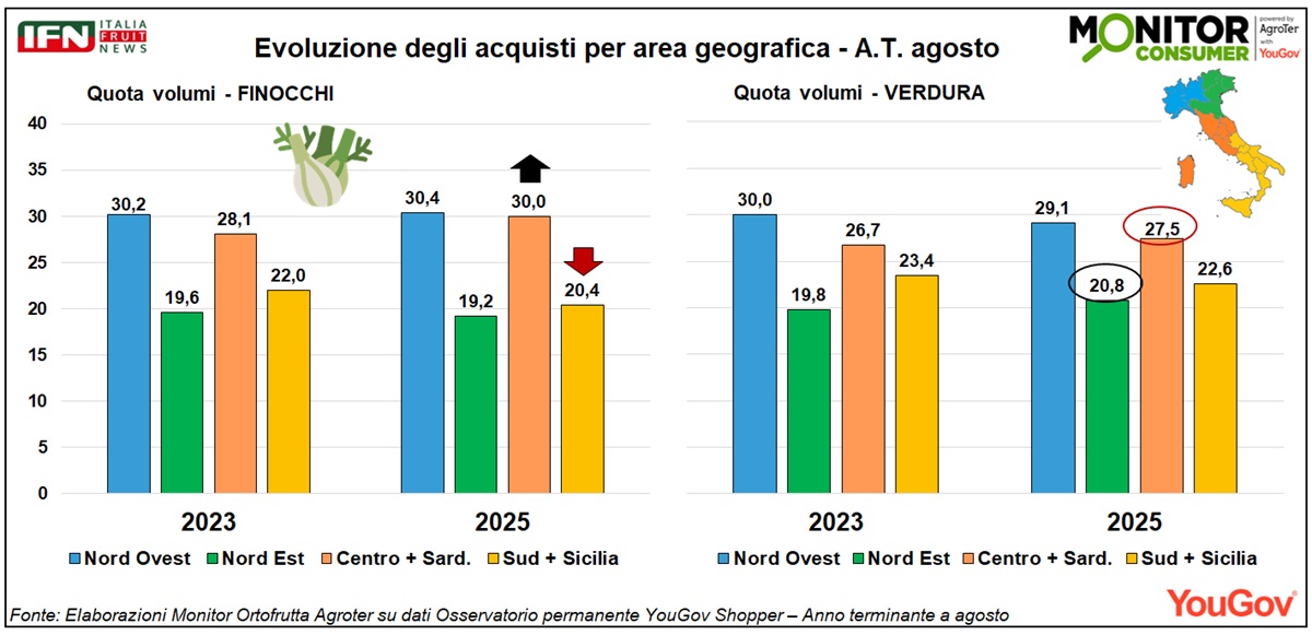 La quota a volume acquistata di finocchi nel Centro Italia (30%) cresce nel 2025 e raggiunge ormai il Nord Ovest (30,4%), mentre il Sud arretra dal 22 al 20,4%. L’aumento della quota del Centro si osserva anche nel comparto delle verdure, sebbene resti su livelli inferiori rispetto al Nord Ovest, che comunque mostra una flessione.