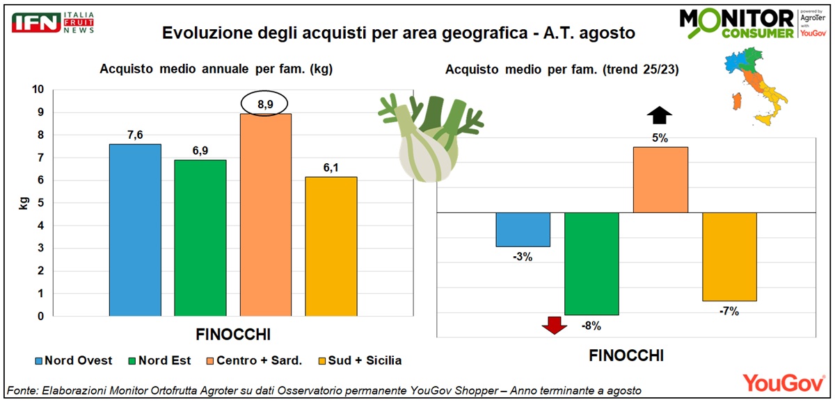 Per quanto riguarda i finocchi, il Centro registra anche il consumo medio annuo più elevato (8,9 kg), rappresentando l’unica area in crescita rispetto a due anni fa (+5%). Al contrario, Nord Est e Sud segnano una diminuzione prossima alla doppia cifra.