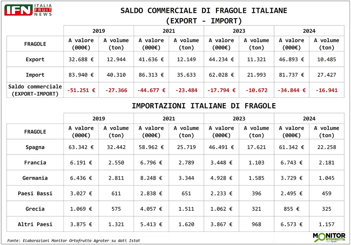 Tuttavia, il saldo commerciale rimane fortemente negativo: l’import di fragole supera l’export sia a valore (-34,8 milioni di euro) sia a volume (-16 mila tonnellate). La Spagna, principale fornitore oltreconfine, ha ulteriormente aumentato le esportazioni verso l’Italia, raggiungendo i 61,3 milioni di euro nel 2024.