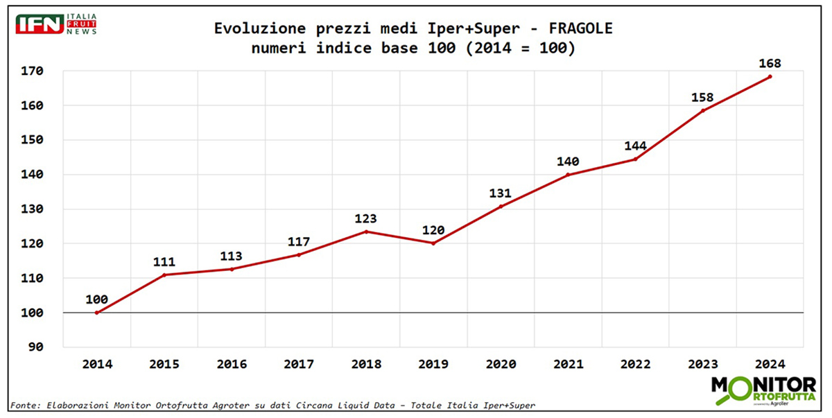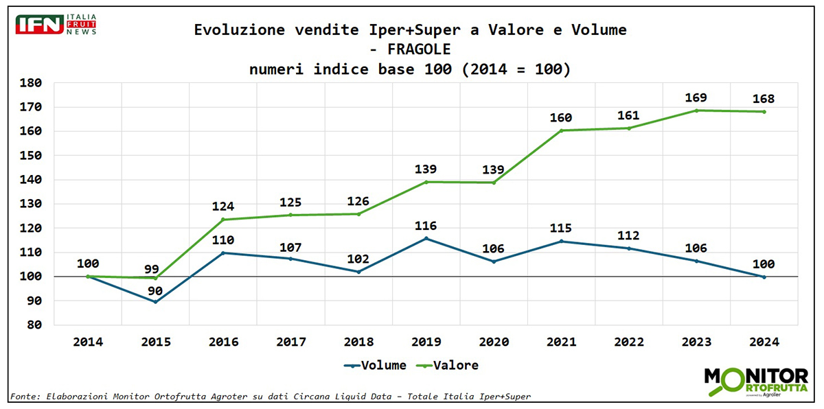 Un’ulteriore conferma arriva dall’analisi del canale Iper+Super: tra il 2014 e il 2024 il prezzo medio delle fragole nei supermercati è aumentato del 68%, seguendo un trend di crescita costante. Questo incremento ha impattato anche il valore delle vendite, in crescita significativa, mentre il volume di fragole vendute è rimasto invariato rispetto a 11 anni fa.