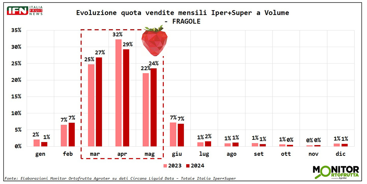 Concludiamo con la stagionalità delle vendite. I dati mensili sulle fragole nel canale Iper+Super evidenziano come il consumo sia fortemente concentrato tra marzo, aprile e maggio, quando si registra il picco del 32% del volume annuo. A giugno si osserva un calo marcato, mentre nei mesi invernali le vendite rimangono marginali.