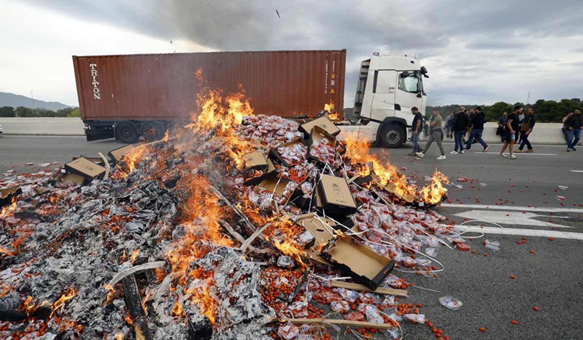 Come riporta la testata spagnola El Pais, i viticoltori francesi si erano organizzati a Narbona per fermare i mezzi che trasportavano vino spagnolo. Oltre a bloccare l’accesso alla frontiera di Le Boulou, i protestanti hanno distrutto e svuotato alcuni veicoli. A terra è finito il vino delle cisterne spagnole, che era pronto per essere imbottigliato in Francia (vedi video sopra), oltre ai carichi di ortofrutta – pomodori in primis – che sono stati successivamente bruciati.
