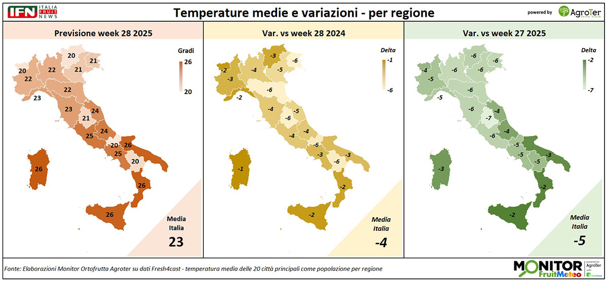 Le analisi del Monitor Ortofrutta si arricchiscono grazie a una nuova collaborazione dedicata a esplorare settimanalmente una variabile spesso decisiva per il settore ortofrutticolo: il meteo. Tra i diversi fattori che influenzano le condizioni climatiche, questa nuova rubrica si concentra in particolare sulle temperature medie registrate lungo la Penisola, con il supporto di Fresh4cast, una piattaforma software in cloud specializzata nella previsione della domanda e nell'ottimizzazione della supply chain per il settore ortofrutticolo.