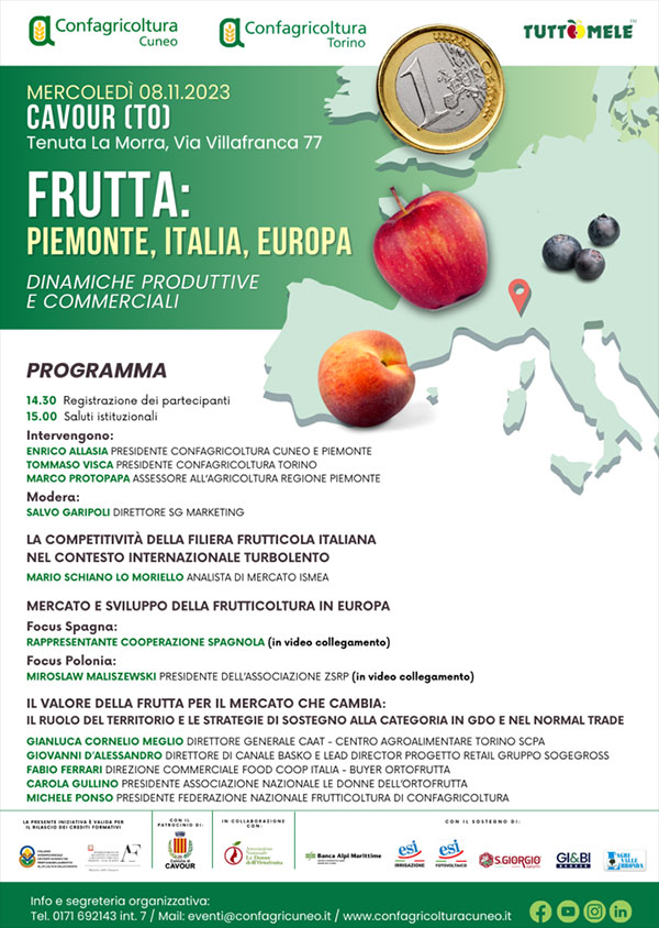 La portata delle riflessioni è sempre più globale e meno regionale. Ma proprio da una regione, il Piemonte (che vede il 36% del suo territorio vocato in generale alla produzione agricola, fonte Ires-Regione Piemonte), parte l’evento che tiene raccolti tutti questi elementi: a Cavour (TO) si terrà infatti, il prossimo 8 novembre, all’interno dell’evento fieristico TuttoMele™, il convegno organizzato da Confagricoltura Cuneo e Confagricoltura Torino dal titolo “Frutta: Piemonte, Italia, Europa – Dinamiche produttive e commerciali”, che vedrà susseguirsi interventi di importanti esponenti della filiera sia produttiva che distributiva e offrirà informazioni sui trend della produzione e sulle dinamiche legate alla vendita. Il convegno, con inizio alle 14,30, si terrà presso l’antica Tenuta La Morra di Cavour ed è patrocinato dal Comune di Cavour.