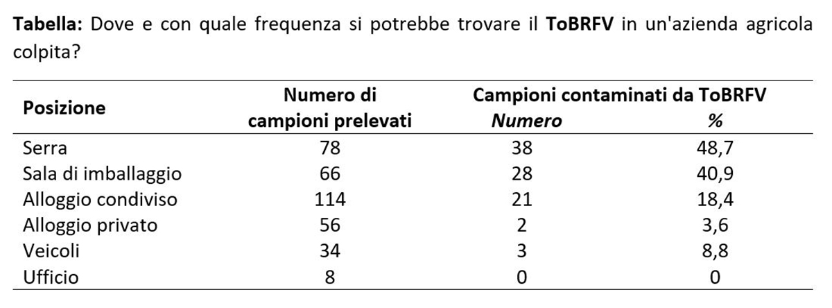 Per verificare se ed eventualmente dove il virus possa essere diffuso internamente durante la produzione di pomodoro, sono stati prelevati centinaia di campioni con tamponi di cotone da numerose superfici dell'intera azienda agricola. Il ToBRFV è stato rilevato in diverse parti dell'azienda, come le serre, la sala di confezionamento, ma anche sulle superfici degli alloggi, ed è stato possibile dimostrare che i virus trovati erano ancora infettivi. Come prevedibile, le superfici della serra, come corridoi, tappeti erbosi e zerbini, sono state più frequentemente contaminate da ToBRFV. Singoli oggetti come gli zerbini o l'utensile da taglio sono risultati positivi al ToBRFV in tutti i campioni prelevati. Non è del tutto sorprendente che anche le superfici del capannone di confezionamento, con molte bilance, utensili e carrelli elevatori, siano risultate ampiamente contaminate dal virus. Tuttavia, il fatto che quasi il 20% di tutti i campioni prelevati negli alloggi comuni sia stato contaminato dal virus è allarmante. Le maniglie delle porte, gli interruttori della luce, i bollitori, i telecomandi della TV e i materassi sono solo alcuni esempi in cui è stato trovato il ToBRFV infettivo.