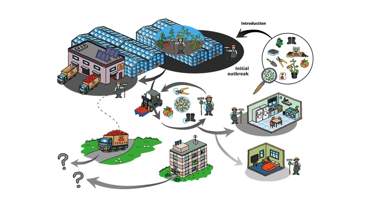 Data la sua grande importanza economica per le aziende agricole, gli scienziati della Humboldt-Universität zu Berlin hanno indagato se e in che misura il virus sia presente in un'azienda agricola di pomodori colpita e quale sia il ruolo dell'uomo in questo contesto. I risultati del campionamento sistematico in un impianto di produzione tedesco colpito da un focolaio di ToBRFV nel 2022 sono impressionanti. Sia gli abiti da lavoro che i guanti e le suole delle scarpe erano altamente contaminati da ToBRFV dopo un solo giorno di lavoro, per cui gli esseri umani, in quanto "superdiffusori", contribuiscono in modo significativo alla rapida trasmissione dell'agente patogeno nella serra e nelle immediate vicinanze.