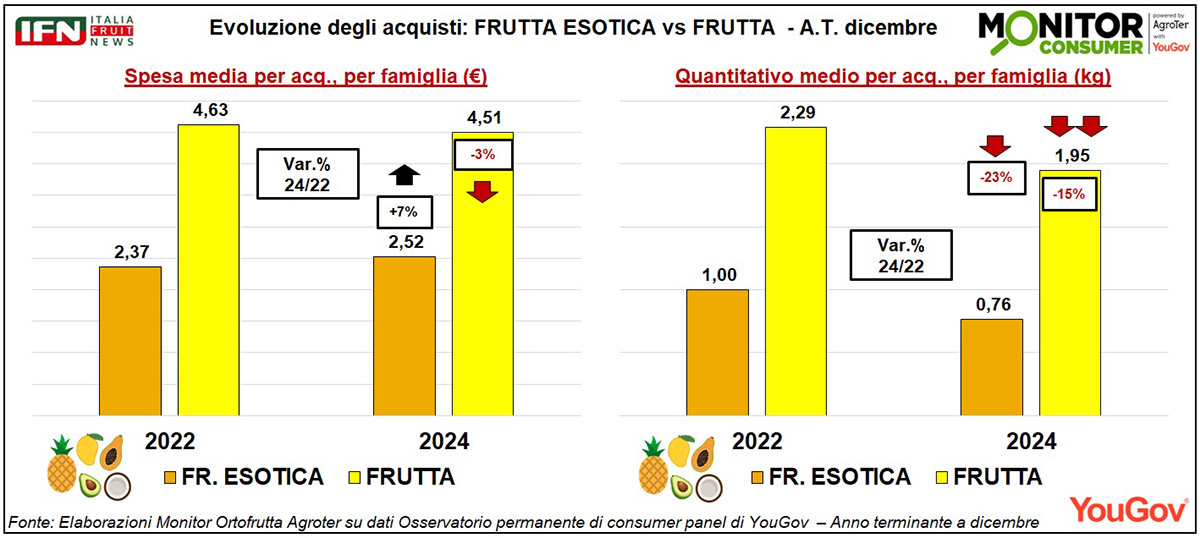 Analizzando la spesa e le quantità medie per singolo acquisto, emerge come le famiglie italiane tendano a dosare con attenzione le quantità acquistate, in particolare nella frutta esotica. Infatti, mentre per la frutta in generale si registra un calo del 15%, per la frutta esotica la diminuzione è ancora più marcata (-23%). Tuttavia, i consumatori sembrano orientarsi verso frutti esotici di qualità superiore, spendendo di più per prodotti selezionati.