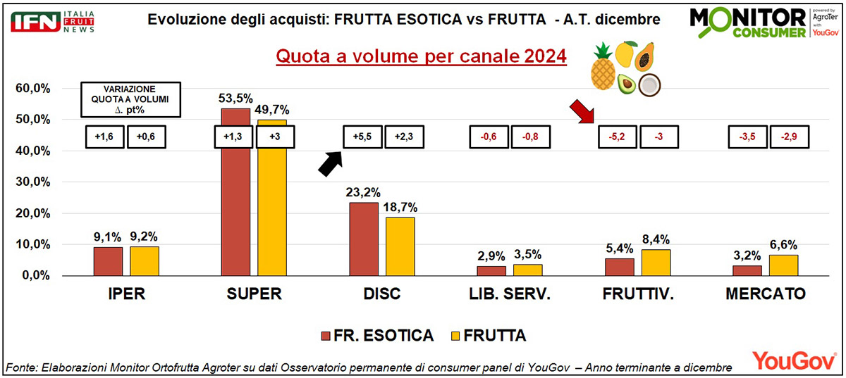 Ben diversa è la situazione nei discount, dove la quota della frutta esotica è aumentata di 5,5 punti, quasi il doppio rispetto alla crescita della frutta nel suo complesso (+2,3 punti). Questo ha portato i discount a conquistare una fetta significativa del mercato dell’esotico, con una quota che si avvicina a un quarto dei volumi totali (23,2%).