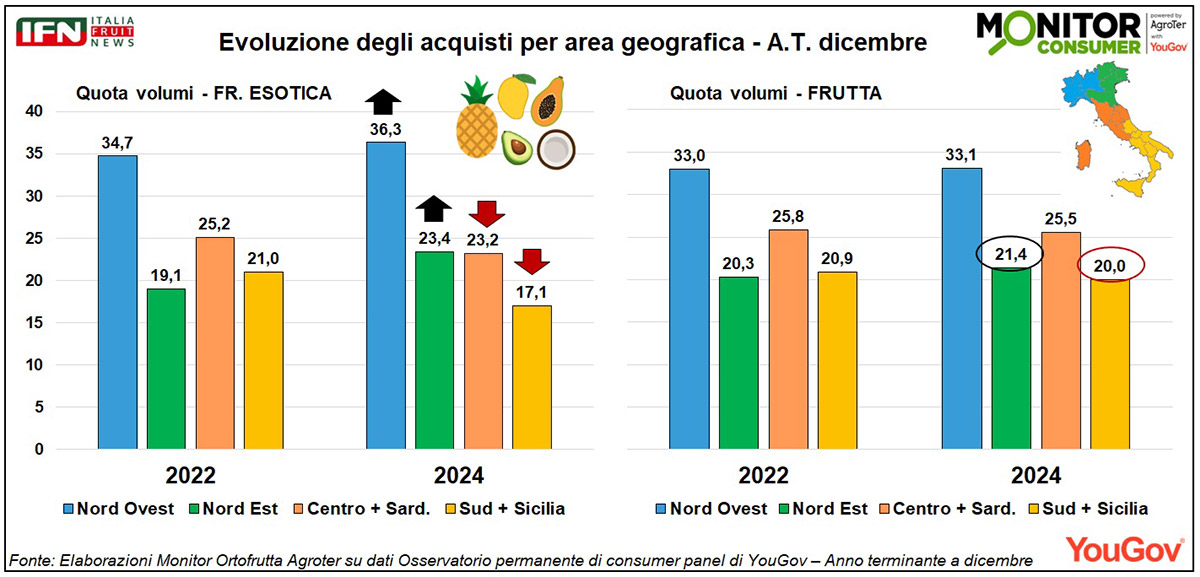 Nel confronto con la frutta in generale, nel 2024 la frutta esotica registra quote più alte al Nord e più basse al Centro-Sud, segnalando un ampio potenziale di crescita nel Mezzogiorno, anche se i trend negativi delle quote a volume in questo areale evidenzia difficoltà nel farlo.