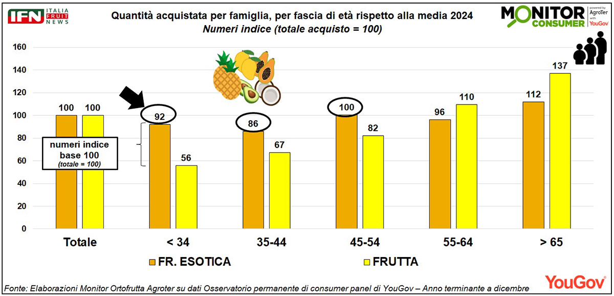 Tali dati confermano una tendenza ben nota: i giovani consumano meno frutta in generale, ma all’interno delle loro scelte d’acquisto la frutta esotica assume un ruolo più rilevante rispetto alle generazioni più mature.
