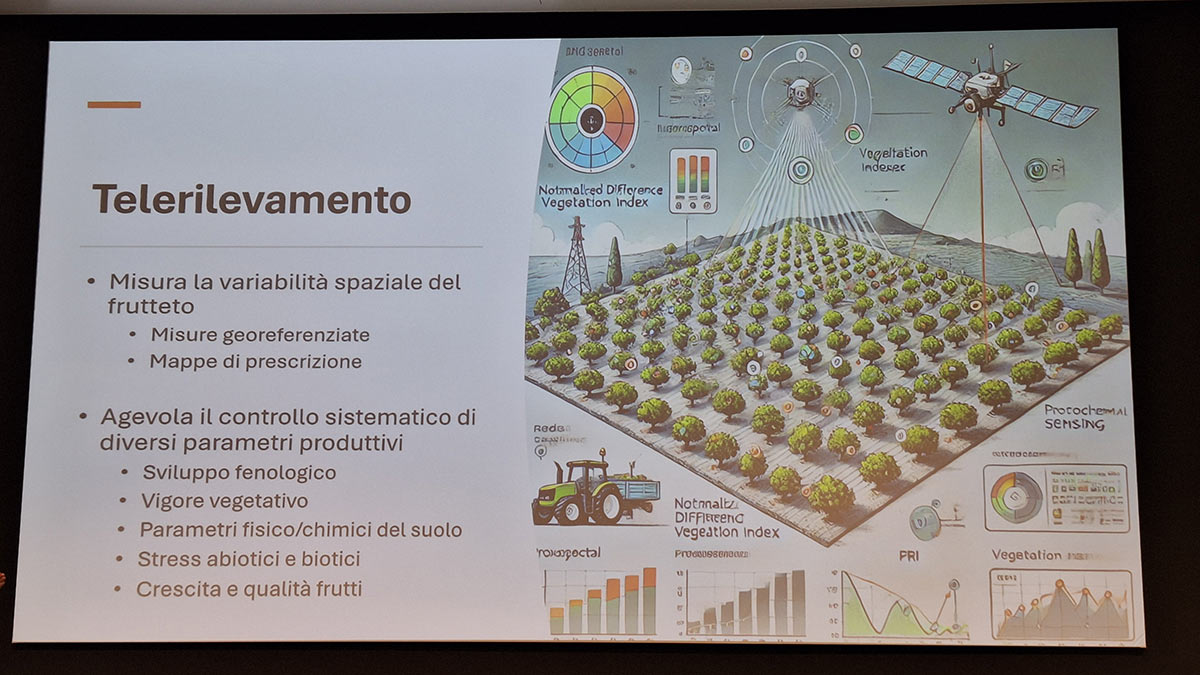 Il professor Damiano Zanotelli dell'Università di Bolzano ha illustrato lo stato attuale della sensoristica applicata ai frutteti: "Da diversi anni disponiamo di strumenti che ci permettono di monitorare vari parametri, dal suolo — come per esempio l'umidità — alla pianta, focalizzandoci su foglie, tronco e frutti, fino alle misurazioni del microclima all'interno del frutteto tramite stazioni meteorologiche. Non ultimo, il telerilevamento, che ci consente di valutare il livello di stress dell'intero frutteto. L'evoluzione futura mira a rendere questa mole di informazioni disponibile in tempo reale, permettendo di adattare le tecniche colturali al variare dei parametri. Il progresso in questo campo è rapido e offre già ampie possibilità di sviluppo."