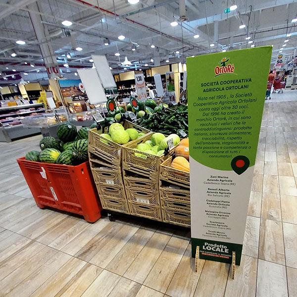 All’inizio del percorso di valorizzazione delle specialità locali era frequente imbattersi in isole dedicate a questi prodotti, che ora sono state eliminate e solo raramente riappaiono in particolari occasioni di attività in-store, con presenza dei produttori nei punti vendita. Ci è capitato di trovarne nelle nostre recenti visite in un paio di Ipercoop a Reggio Emilia, per enfatizzare l’azienda Coop Ortolani, con prodotti a marchio ORTORE', sostanziata in oltre 10 articoli di cui 6 di meloni e angurie e altrettanti di verdure, con zucche, cavoli e cipollotti. Si tratta di iniziative che durano un paio di settimane, che reputiamo molto valide perché creano valore e aiutano ad avvicinare i prodotti e i produttori ai consumatori, con il limite però che, non essendo sostenibili economicamente in continuativo, non si possono proporre con frequenza. Crediamo, tuttavia, che facendo una programmazione adeguata, alternando così i vari produttori, si darebbe ulteriore valore e spinta a questi prodotti, soprattutto nei mesi della frutta estiva.