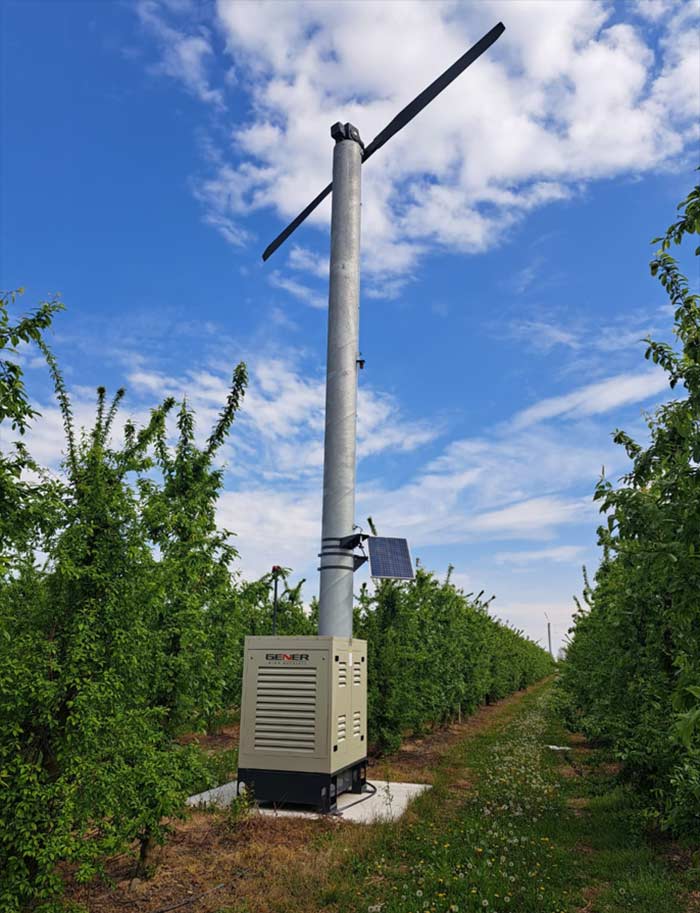 Arcangelo Giammusso, amministratore di Gener nonché presidente del Cda dell'impresa spiega a IFN il funzionamento della ventola. “In questo caso si tratta del nostro modello S 60 in grado di proteggere coltivazioni fino a 7 ha, è costituito da una torre fissa in acciaio zincato a caldo da 8mm di spessore, alta 10,50Mt, da un’elica in fibra di vetro da 6,00Mt e da una cabina motore con quattro sportelli di ispezione e manutenzione – dotati di serrature - allarmati (con sirena), all’interno della quale è alloggiato anche il serbatoio da 450 litri. La macchina è dotata da innovativi sistemi e applicazioni tecnologiche dell’Industria 4.0, che consentono la trasmissione digitale all’agricoltore dei parametri rilevati in campo”.