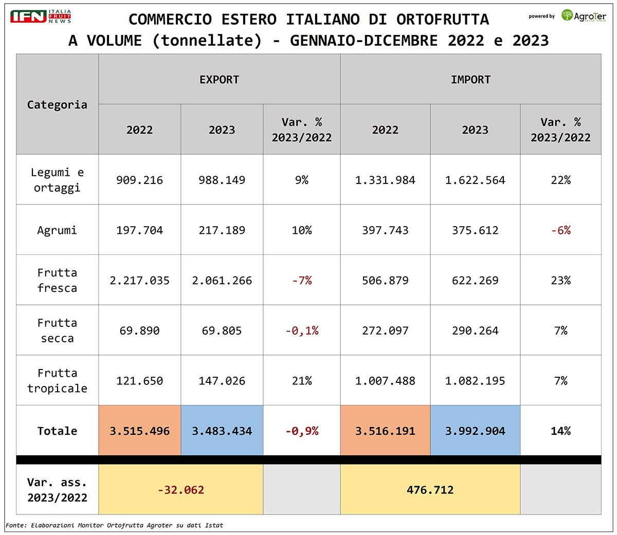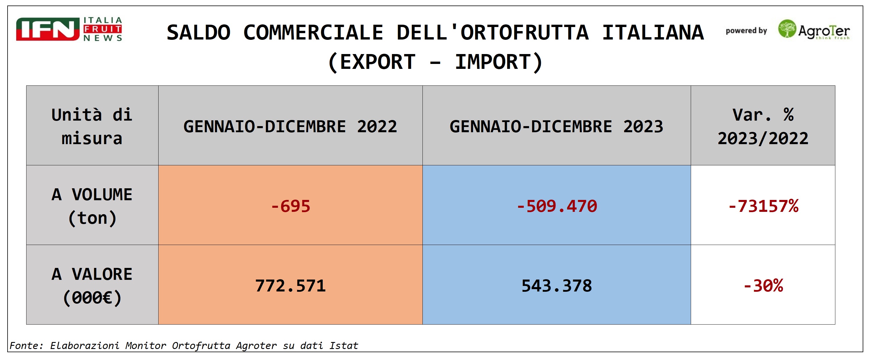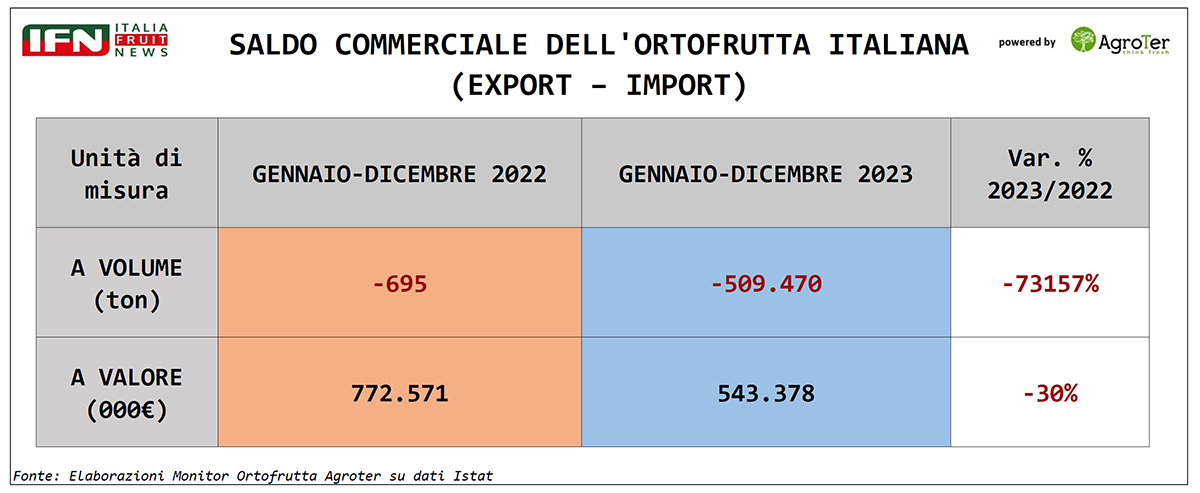 Un anno fa, analizzando il consuntivo 2022 del commercio estero italiano, titolavamo che era stata una debacle per l’ortofrutta italiana, poiché c’era stato il sorpasso a volume dell’import sull’export, con saldo in negativo di 100 mila tonnellate (clicca qui per approfondire).