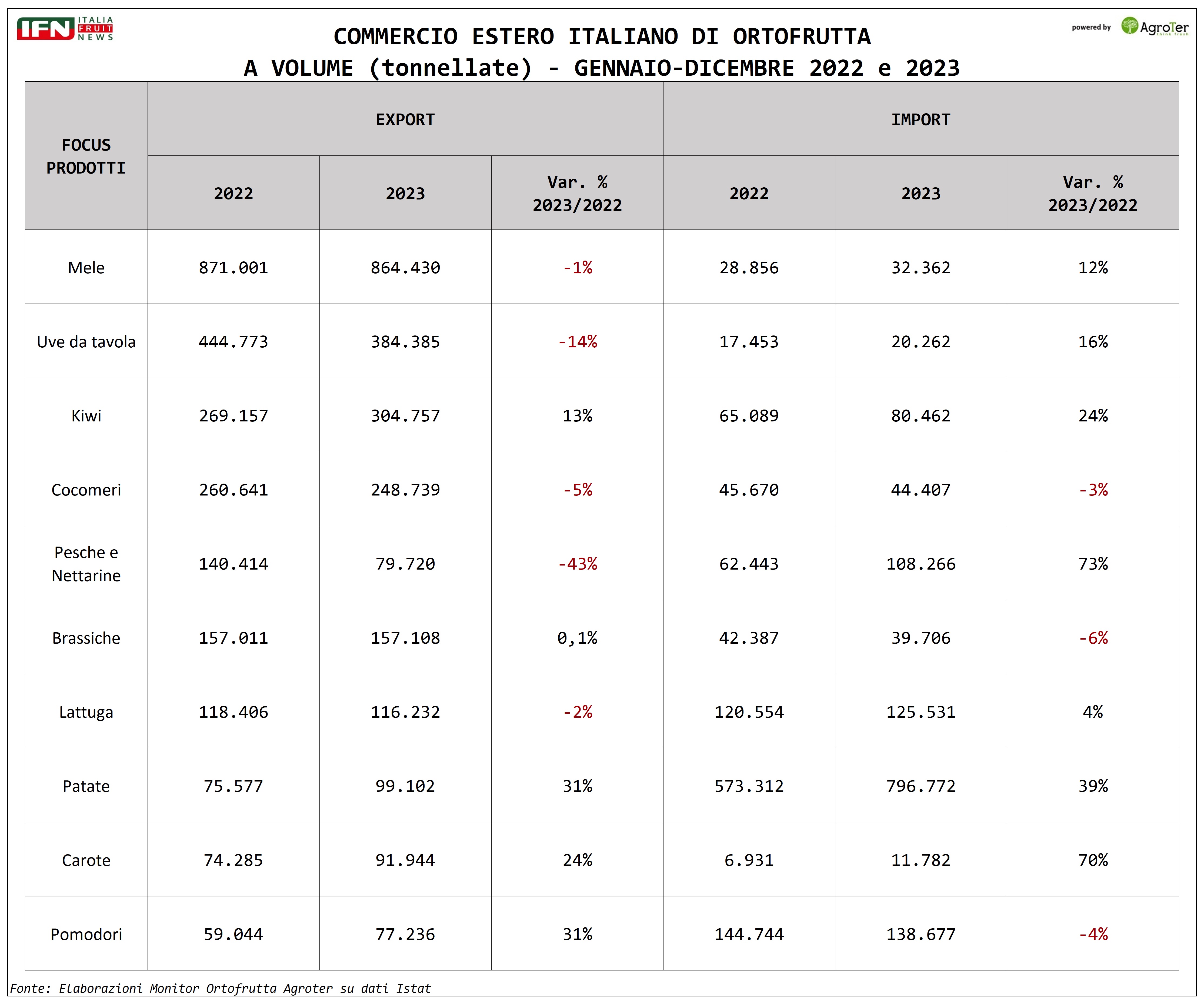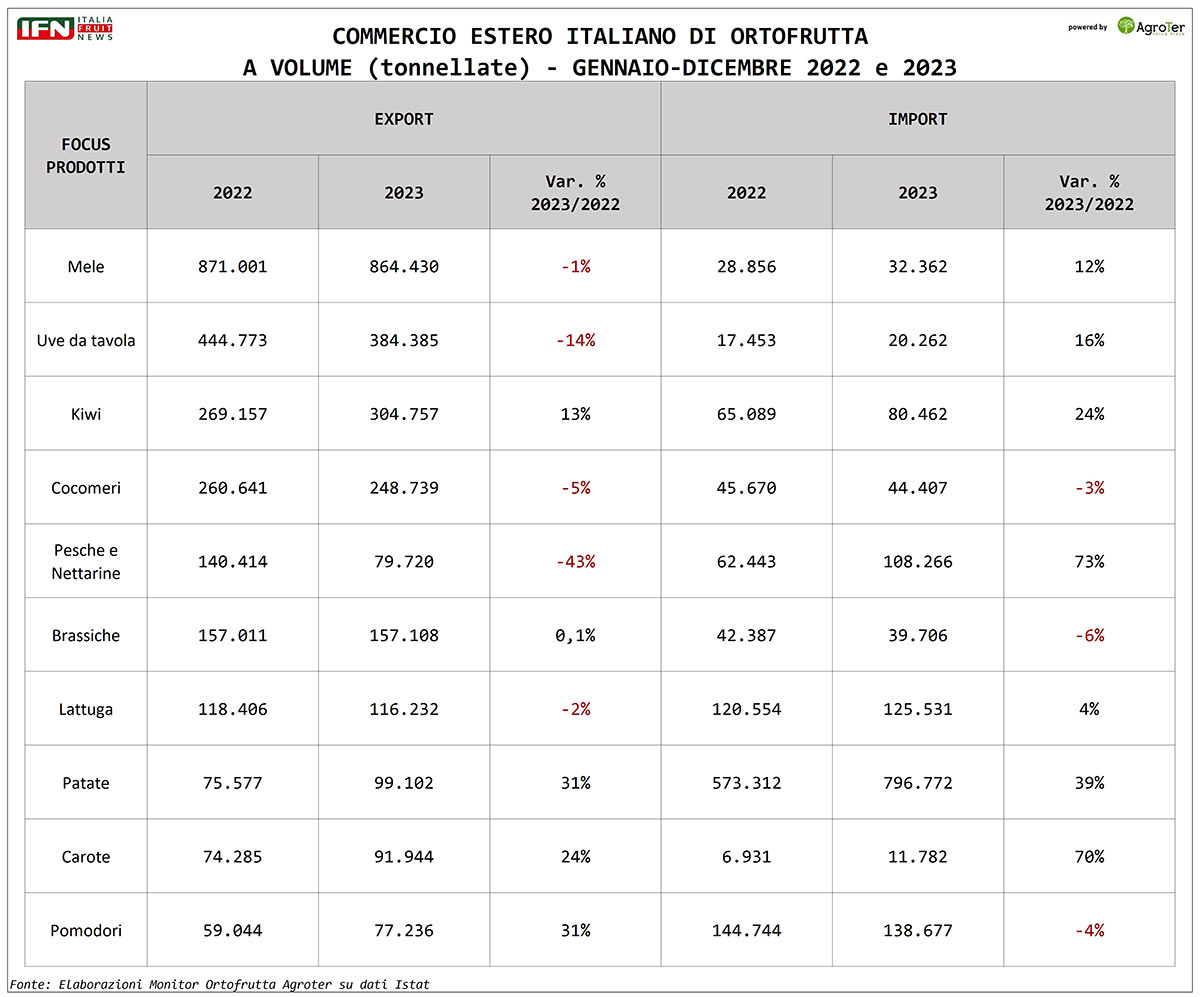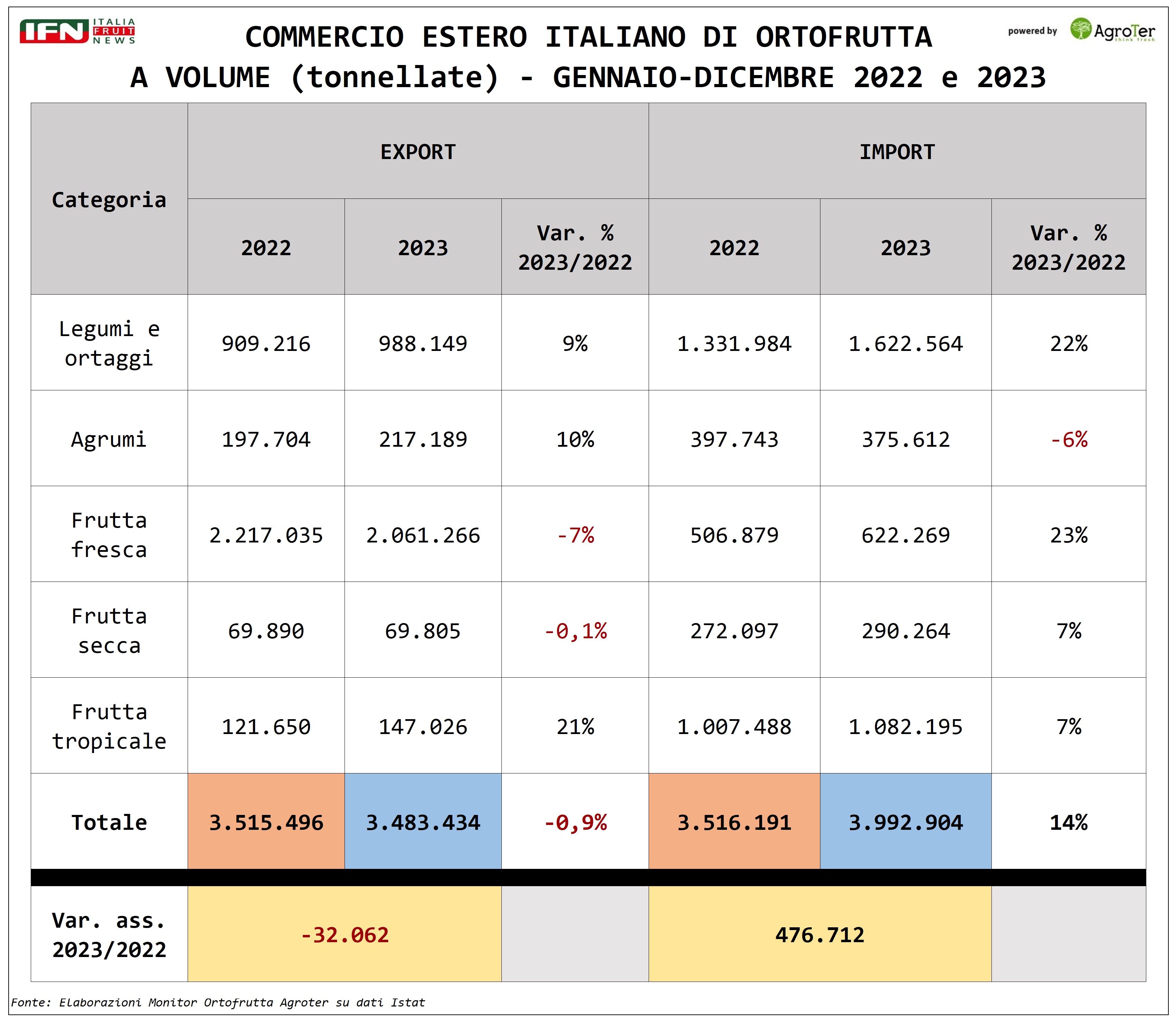 Un anno fa, analizzando il consuntivo 2022 del commercio estero italiano, titolavamo che era stata una debacle per l’ortofrutta italiana, poiché c’era stato il sorpasso a volume dell’import sull’export, con saldo in negativo di 100 mila tonnellate (clicca qui per approfondire).