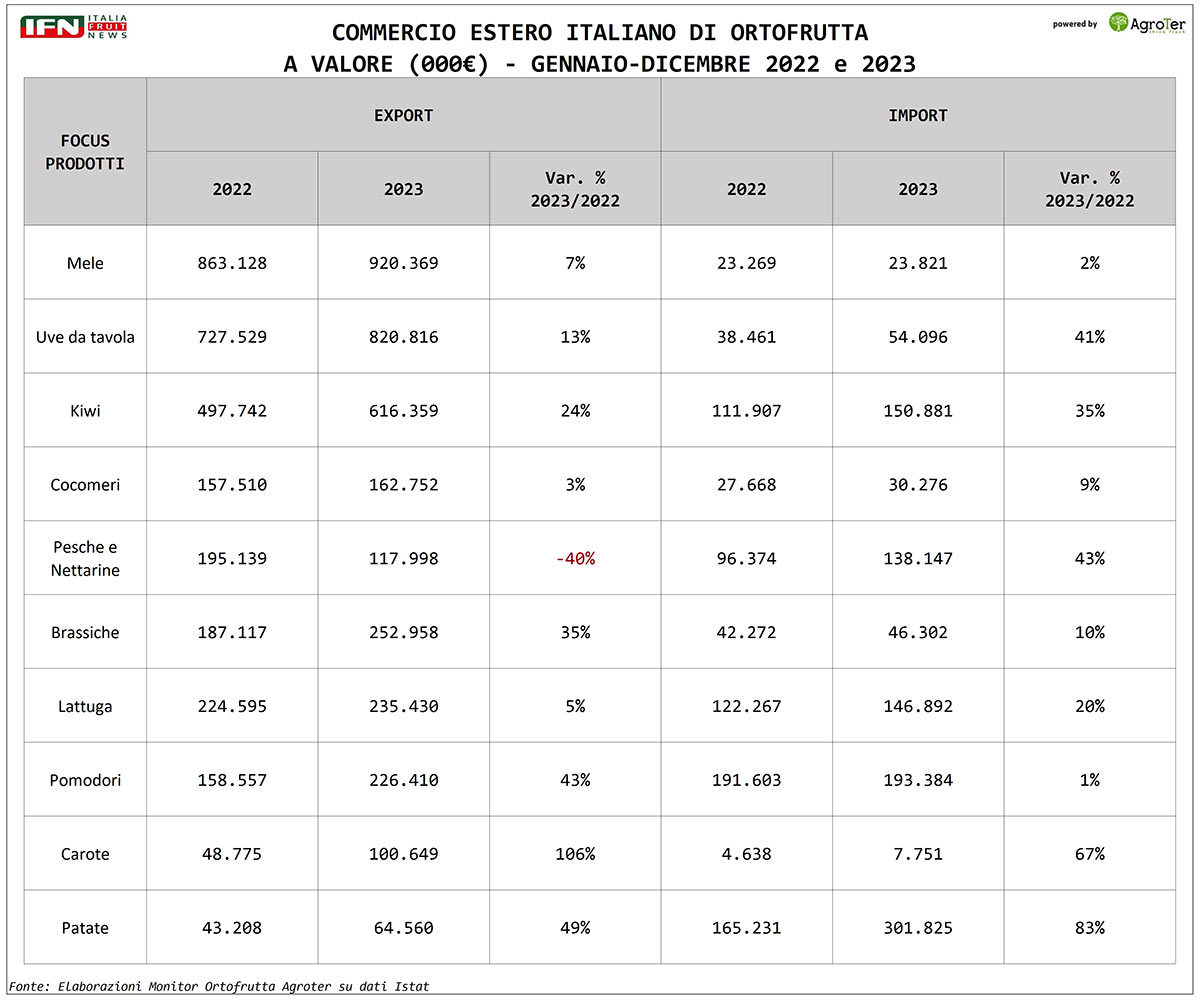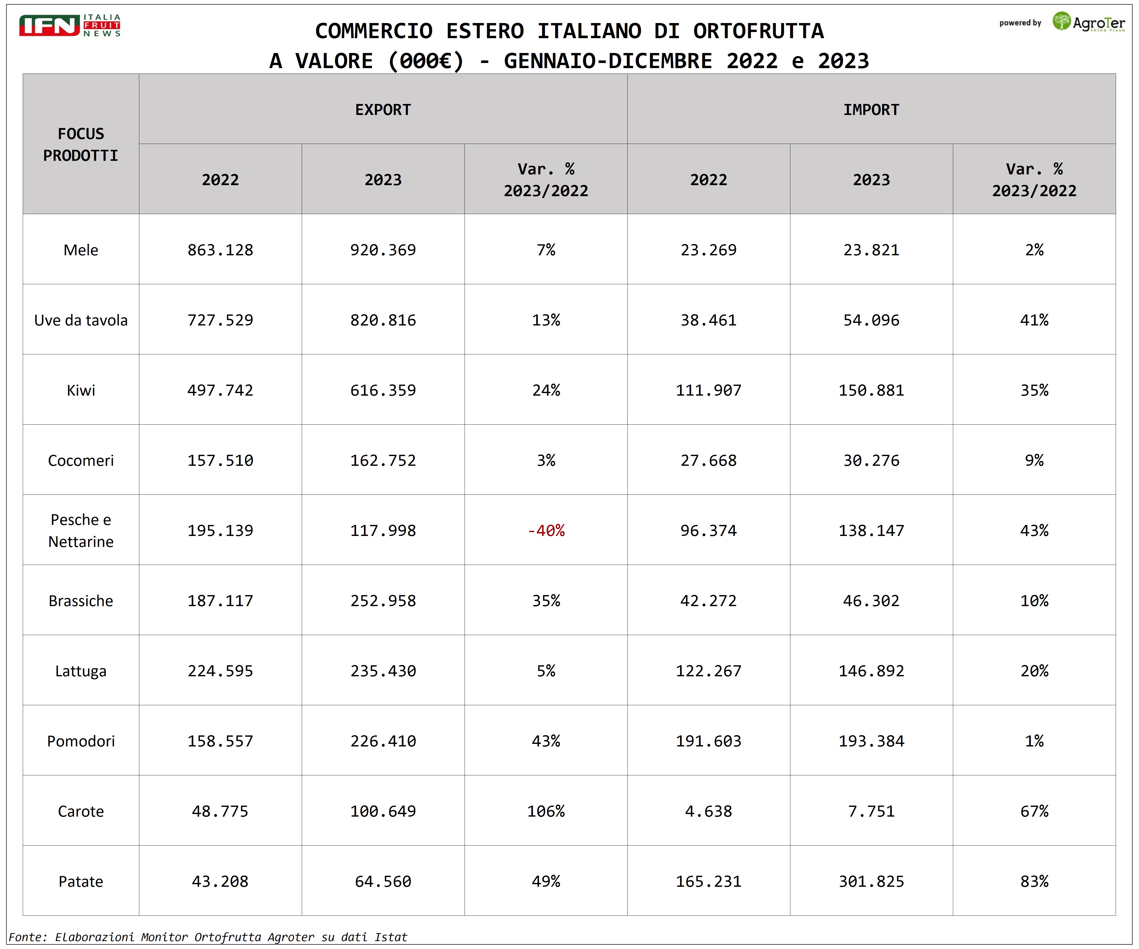 In crescita anche le importazioni di kiwi, soprattutto a valore, pari a 150 milioni di euro, ma in questo caso il dato è ben controbilanciato dall’export, che supera i 600 milioni di euro. Le mele si confermano il prodotto ortofrutticolo più esportato nel mondo, nonostante i quantitativi in leggero calo (-1%), ben bilanciati da un valore in crescita del 7%, per un totale che supera 900 milioni di euro. Infine, si evidenziano gli ottimi riscontri nelle esportazioni di brassiche, pomodori e carote, che mostrano incrementi a doppia cifra a valore. (gc)