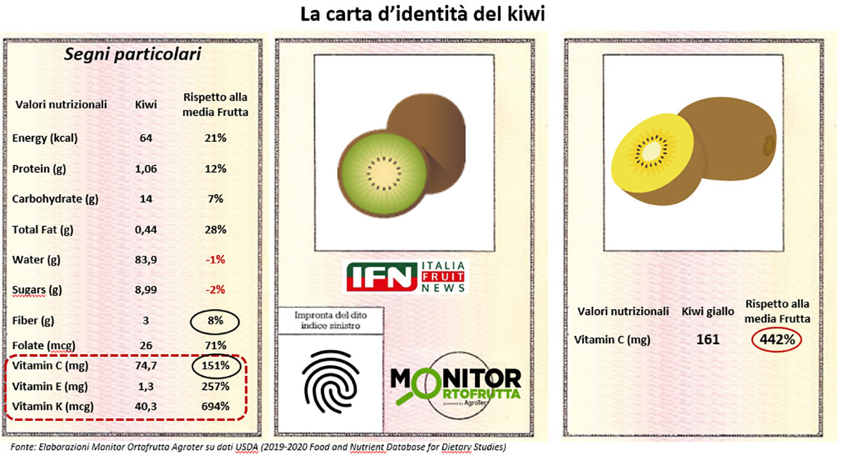Oltre all’elevato contenuto in fibra, è ormai idea consolidata che il kiwi sia anche uno dei frutti con più vitamina C, cos assolutamente vera. Con oltre 74 mg di acido ascorbico, supera del 151% la media della frutta. Nel caso del kiwi giallo (161 mg di vitamina C) siamo al +442%, un valore che è quasi triplo rispetto all’arancia (56), prodotto diventato ormai stereotipo nelle confezioni di integratori per questa vitamina. Questo dato eclatante porta questa tipologia di actinidia sul podio dei frutti, ad alta penetrazione in Italia, per la maggior concentrazione di vitamina C.