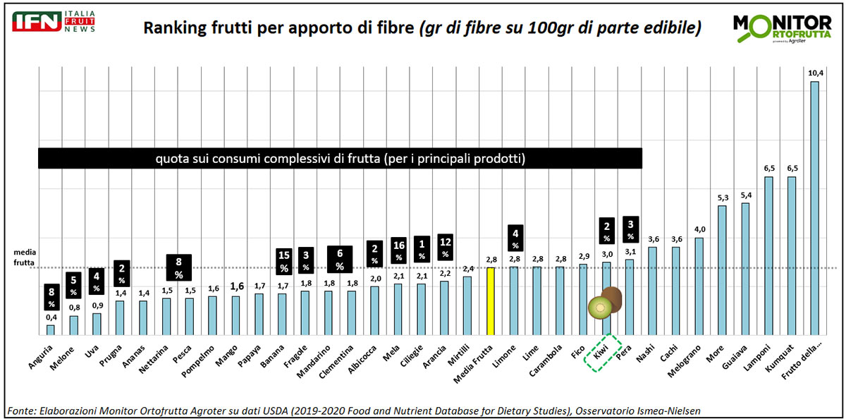Veniamo alla fibra: dopo la pera, il kiwi è effettivamente il frutto ad alta penetrazione con il maggiore apporto di fibra. Questo, infatti, è pari a 3 grammi su 100 di parte edibile, mentre la pera ne ha pochi di più (3,1) e il fico, grande alleato per chi ha problemi intestinali, ne ha leggermente di meno (2,9). Per cui, considerando le fibre contenute per cento grammi e la quota sui consumi (il 2% annuo della frutta), possiamo affermare che anche il kiwi, come la pera, sia un frutto chiave nell’apporto di fibra per i consumatori italiani.