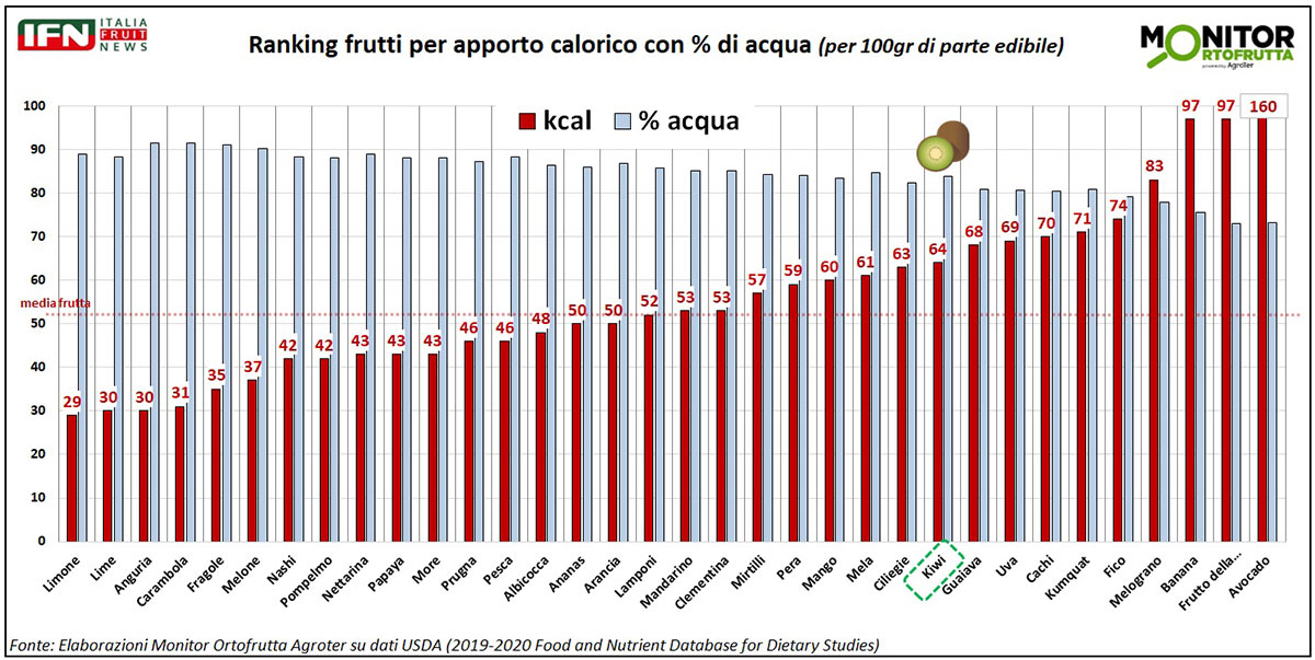 Iniziamo dall'apporto energetico: sebbene il kiwi non sia tra i frutti meno calorici, la sua energia non si discosta molto dalla media della frutta. Contiene 64 calorie per 100 grammi di parte edibile, il che significa che fornisce più energia dell’arancia (50 kcal) o della mela (60 kcal), ma meno dell’uva (69) o del fico (74), con un contenuto di acqua (84%) abbastanza in linea con quello della frutta in generale.
