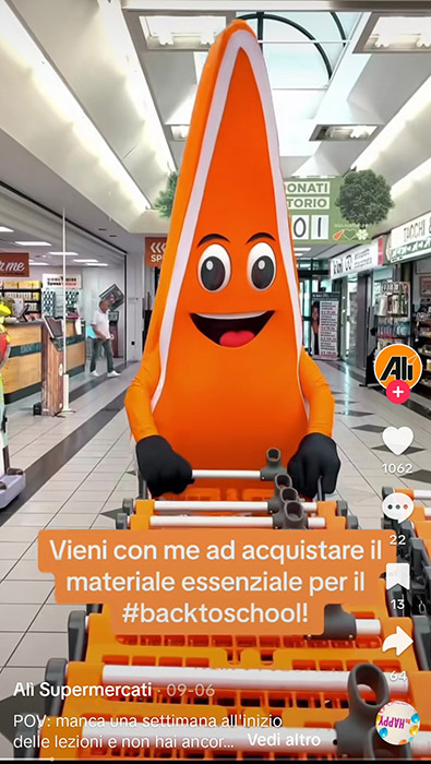 Sul profilo di Alì la comunicazione passa attraverso l’utilizzo di una mascotte che rappresenta l’accento sulla ì del brand e che ne riprende il colore arancione: questa viene filmata mentre fa la spesa girando tra i reparti e gli scaffali o mentre parla di argomenti specifici, ad esempio come affrontare il back to school in modo positivo acquistando cancelleria nell’insegna.