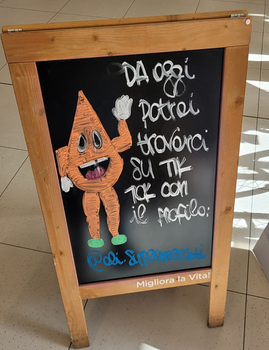Nelle ultime settimane, durante una rilevazione in un punto vendita Alì, una lavagnetta posta all’ingresso ha catturato la nostra attenzione: “Da oggi potrai trovarci su Tik Tok con il profilo @ali.supermercati” c’era scritto. La call to action era molto velata, per non dire assente, ma noi abbiamo subito digitato il nome della pagina nella barra di ricerca del nostro device.