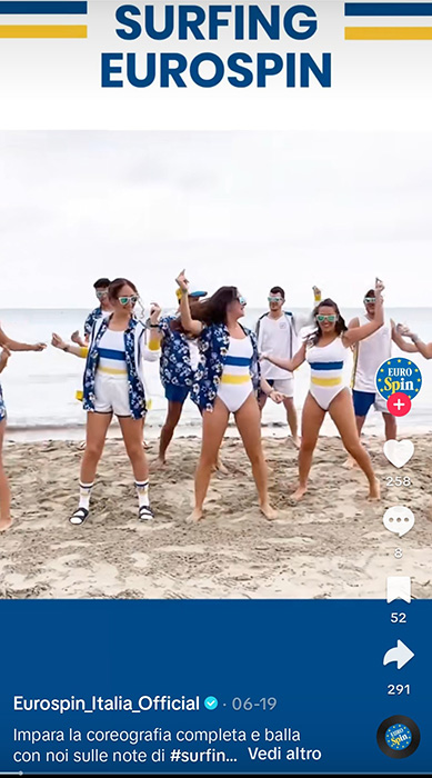 Eurospin, forte della sua community che conta oltre 120 mila persone, racconta le sue iniziative come concorsi, sponsorship e i prodotti a scaffale, coinvolgendo i propri dipendenti, attori o influencer, come Christian Vieri e Costanza Caracciolo per pubblicizzare una delle sue private label; tra i contenuti spiccano anche sfide per replicare balletti e coreografie per coinvolgere il pubblico.