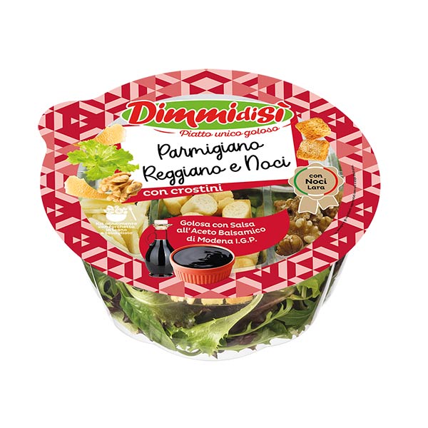 L’Insalata con Parmigiano Reggiano e Noci Lara, invece, è la new entry della gamma Golosa, una proposta di primissima qualità, nella quale al prezioso Parmigiano Reggiano si affiancano Noci italiane varietà Lara, il tutto valorizzato dalla salsa con “Aceto balsamico di Modena IGP”.