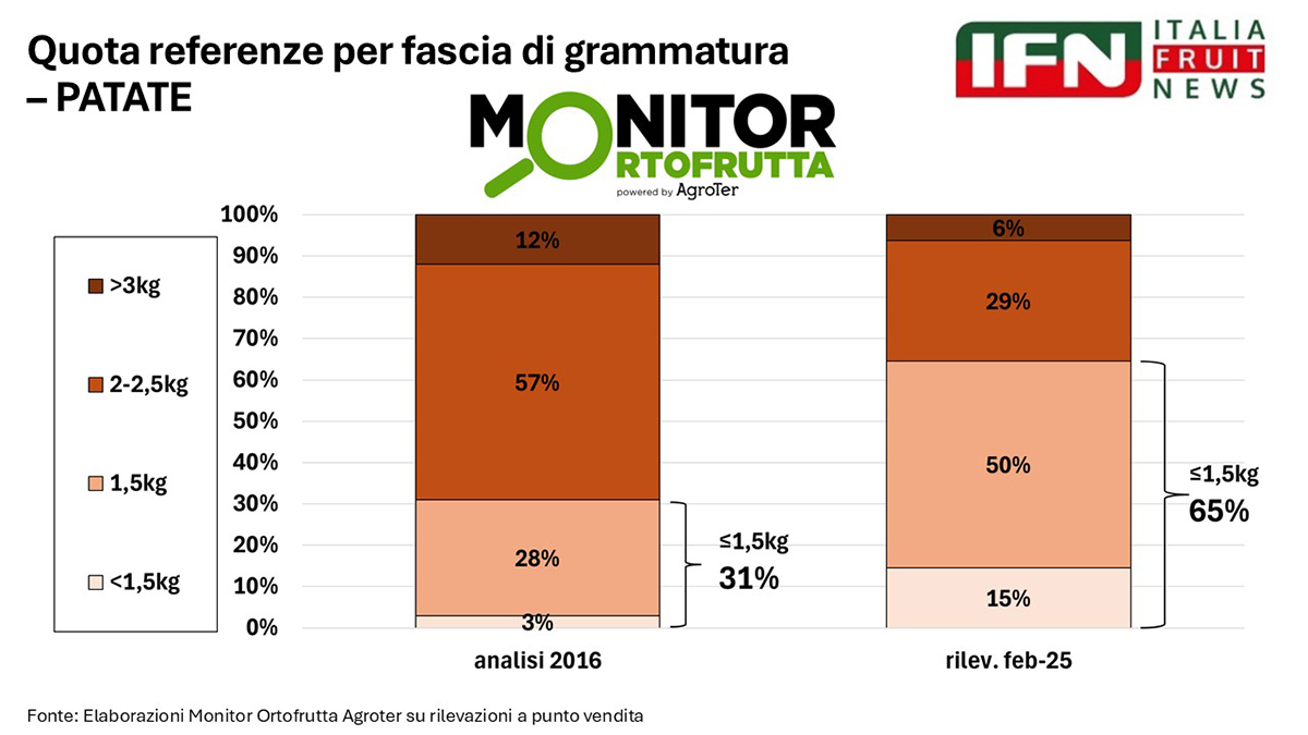 “La vera diversificazione dell’offerta avviene invece nel segmento delle confezioni da 1,5 kg, che rappresentano circa il 60% delle vendite. Qui si registra una forte presenza dei brand, mentre al contempo lavoriamo molto sulla destinazione d’uso. Notiamo, senza dubbio, un crescente interesse per le patate a Indicazione Geografica, come DOP e IGP, sempre più apprezzate dai clienti. Anche il segmento ‘Residuo Zero’ e il biologico stanno guadagnando terreno”.