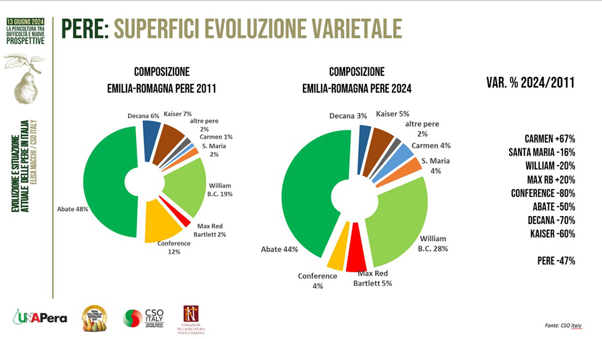 Infatti, secondo le analisi del CSO Italy, la superfice di Decana in Emilia-Romagna - principale areale produttivo nazionale con 11.300 ettari coltivati nel 2024 – vale appena il 3%, ben al di sotto di Abate Fétel, che primeggia con il 44%, e di Williams, che segue con il 28%. Le altre varietà, come Kaiser, Conference, Carmen, Santa Maria e Max Red Bartlett mostrano una quota tutto sommato abbastanza simile, anche se superiore alla Decana, che ha perso ben il 70% delle superfici dal 2011, superata solo dalla Conference (-80%).
