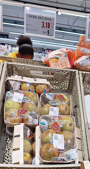 A questo punto è lecito chiedersi: se è una delle referenze di pere più presente nei banchi dei supermercati, come può l’offerta italiana – che abbiamo detto essere ai minimi termini – soddisfare queste richieste? Semplice, non riesce, per cui ci si approvvigiona all’estero con il prodotto Belga-Olandese, che, non a caso, è la provenienza principale che abbiamo trovato nel 60% delle referenze di Decana. Fra l’altro, i prezzi sono del tutto in linea con quelli italiani, quindi, anche se fosse stata comprata dai buyer a quotazioni più basse, viene comunque valorizzata al pari delle referenze nazionali, perché evidentemente il consumatore riconosce i plus di questa cultivar.
