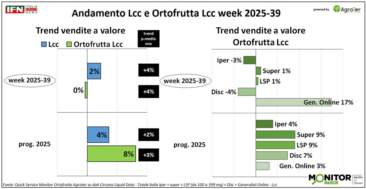 Week 39: l’ortofrutta Lcc arranca ancora (-4% a volume) e il prezzo medio mix sale (+4%)