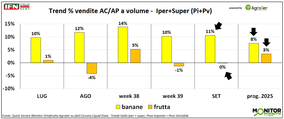 Nella trentanovesima settimana dell’anno si registra un calo delle vendite a volume di ortofrutta a peso imposto nella Gdo, con un peggioramento rispetto alle settimane precedenti. Tutti i canali fisici risultano in flessione, in particolare ipermercati e discount, mentre l’online continua a crescere con un incremento a doppia cifra. All’interno del reparto ortofrutta, però, alcune categorie si distinguono per le buone performance: con la riapertura delle scuole, le banane tornano protagoniste, mostrando un andamento positivo e a doppia cifra.