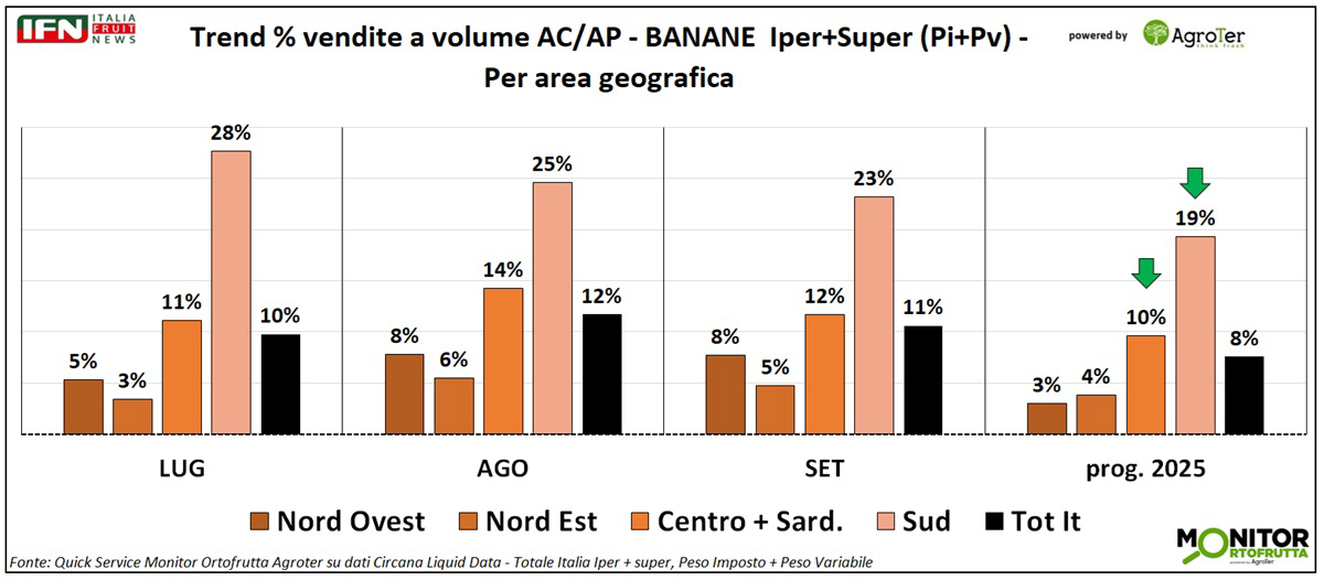 Un’analisi per area geografica evidenzia trend particolarmente positivi nel Centro-Sud Italia. Da inizio anno, le vendite di banane aumentano di 3-4 punti al Nord, ma registrano crescite più marcate al Centro (+10%) e soprattutto al Sud (+19%), dove l’espansione della Gdo continua a sostenere l’andamento favorevole ormai da tempo.