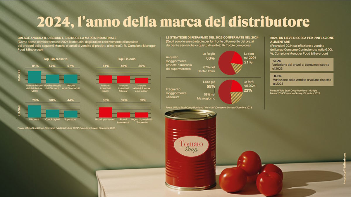 Sul fronte macroeconomico, se la recessione appare oramai come scongiurata, le previsioni 2024 ci riportano in un’Italia dello zero virgola. Secondo i manager intervistati dall’Ufficio Studi Coop, la crescita del PIL stimata allo 0,5% per i prossimi 12 mesi ci rende comunque più lenti dell’Europa, e l’83% dello stesso campione è convinto che le sacche di povertà e i fenomeni di vulnerabilità sociale e economica nel nostro Paese siano destinati a aumentare. A fronte di una inflazione alimentare ancora sostenuta (per i manager stimata al 3% nella media d’anno), nel tentativo dunque di difendere i propri consumi e la loro qualità, gli italiani sembrano essersi definitivamente convertiti alla MDD (Marca del distributore) che nel 2023 ha fatto segnare il record di fatturato (13,7 miliardi di euro) e di quota (22,2 che diviene 31,5% se si tiene conto dei discount (25,4 miliardi complessivi) anche nel 2024 promette di registrare ottime performance; l’82% dei manager italiani prevede un aumento della quantità acquistata, mentre al primo posto tra le scelte di acquisto in riduzione si trovano le marche industriali. Non solo quelle minori e dei produttori follower (in calo rispettivamente per il 51% e il 48% degli intervistati), non fanno eccezione nemmeno le marche leader tanto che un buon 36% ne immagina la rinuncia all’acquisto.