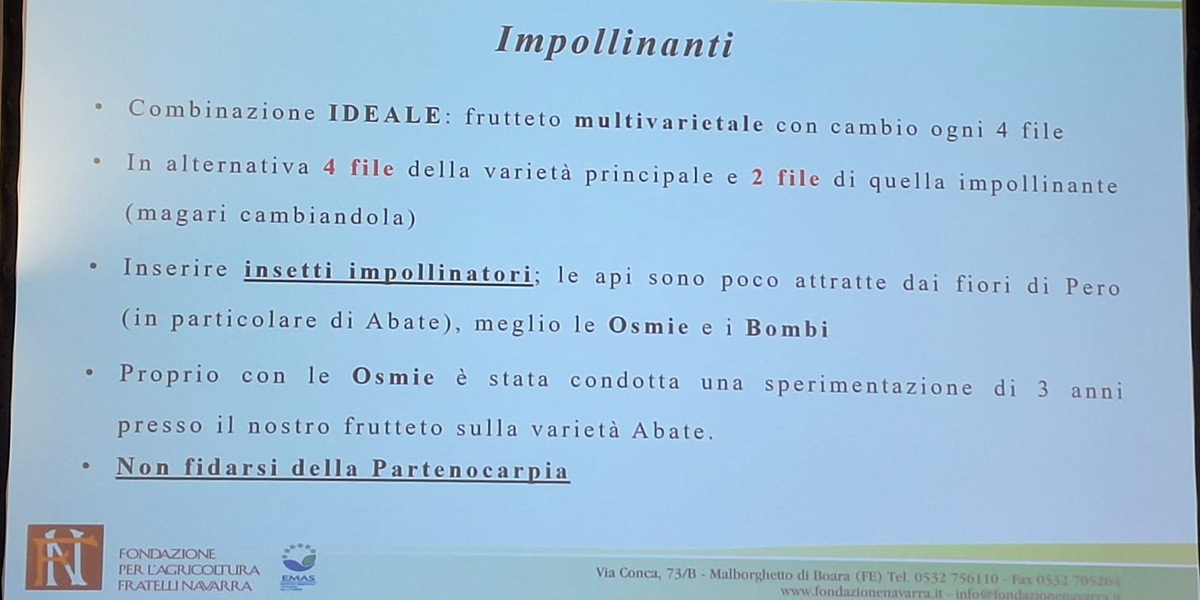 Se la ricerca applicata ha potenzialità a dir poco sorprendenti, Michele Mariani, Agronomo della Fondazione per l'Agricoltura F.lli Navarra, ha ribadito come si debba ripartire dai fondamentali dell’arboricoltura, troppo spesso sottovalutati dai pericoltori, ma che spesso sono la causa di queste rese così basse: “Bisogna tornare all’impollinazione incrociata, e finirla con impianti monovarietali puntando tutto sulla partenocarpia. Idealmente ogni 4 file occorre inserire una varietà diversa, che faccia da impollinatore, e, soprattutto, bisogna verificare che l’impollinante non abbia con sé fattori di sterilità che possono compromettere il buon esisto dell’impollinazione. Per esempio, impollinare l’Abate con la Decana non ha senso perché sono incompatibili. Inoltre, utilizziamo gli insetti pronubi, meglio le osmie e i bombi invece che le api”.