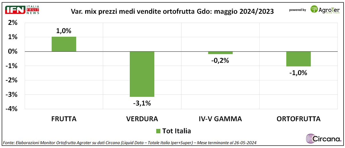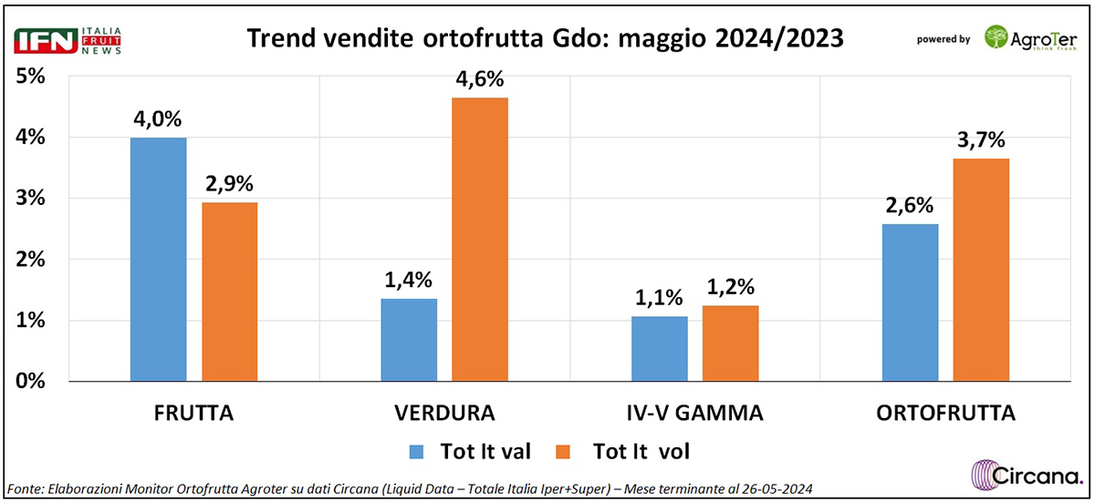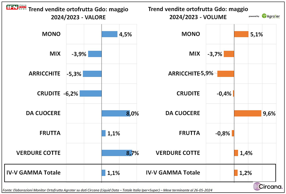 Si regista un punto di deflazione complessivo, che diventano 3 nella verdura, macrocategoria che cresce più delle altre in termini di consumi (+4,6%). Anche la frutta cresce a volume (+2,9%) ma per questa, invece, si osserva un aumento del prezzo medio mix (+1%), mentre IV-V Gamma c’è staticità complessiva a livello di medio mix con vendite in crescita, anche se in modo più limitato rispetto alle altre macrocategorie (+1,2% a volume), ma con un netto miglioramento rispetto ai mesi precedenti.