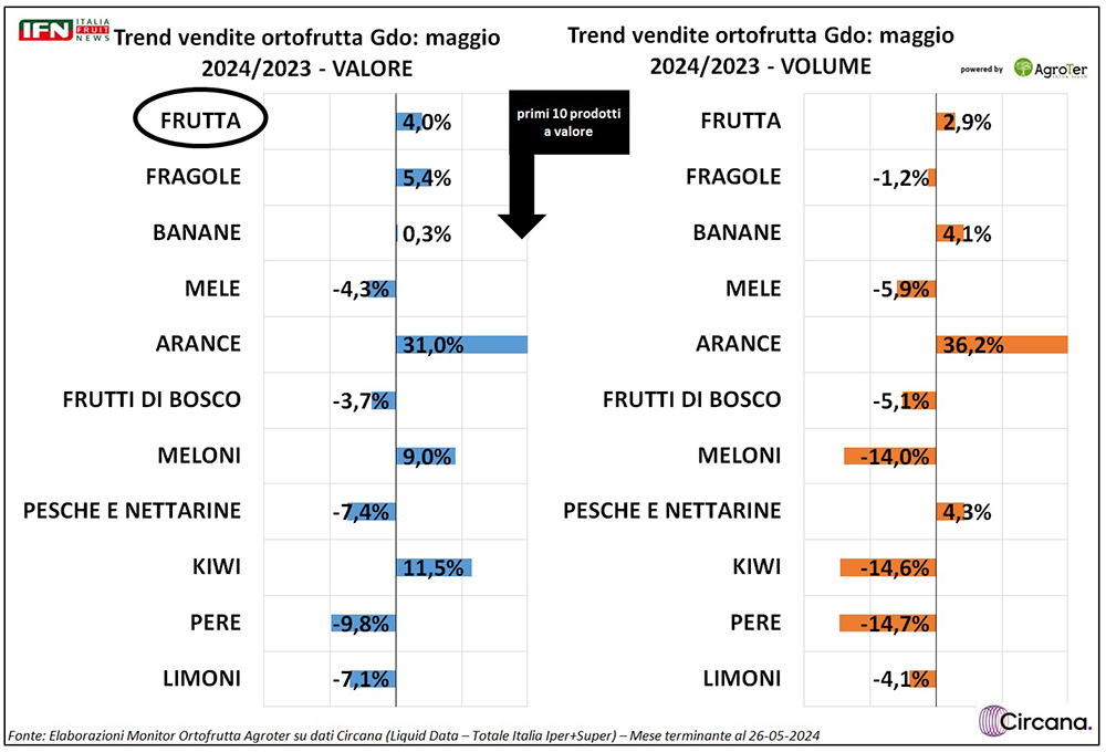 Scendendo nel ranking, solo arance e pesche-nettarine crescono. Tuttavia, nel caso delle arance, la buona performance dei prodotti a fine campagna portano risultati eclatanti nel periodo (+36,2%), anche se non bastano a compensare i trend negativi da inizio anno. In tutti gli altri casi, i volumi flettono con una crescita del prezzo medio mix che, in certi casi, diviene importate (vedi meloni o kiwi).