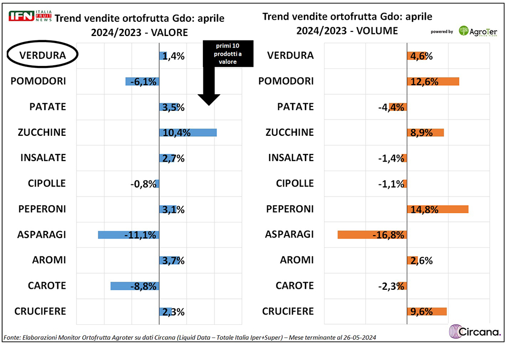 Subito dopo, le patate, hanno un comportamento opposto, con volumi flettenti (-4,4%) e valori in crescita (+3,5%), ma la terza posizione – occupata dalle zucchine – ritorna a perorare la causa della verdura, addirittura con vendite a valore (+10,4%) che crescono di più dei volumi (+8,9%). Scendendo nella classifica, crescono a volume anche peperoni (+14,8%), aromi (+2,6%) e crucifere (+9,6%), in coda nel ranking.
