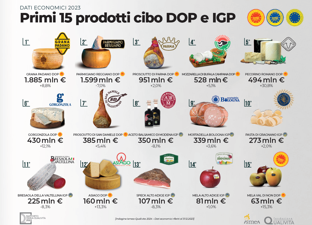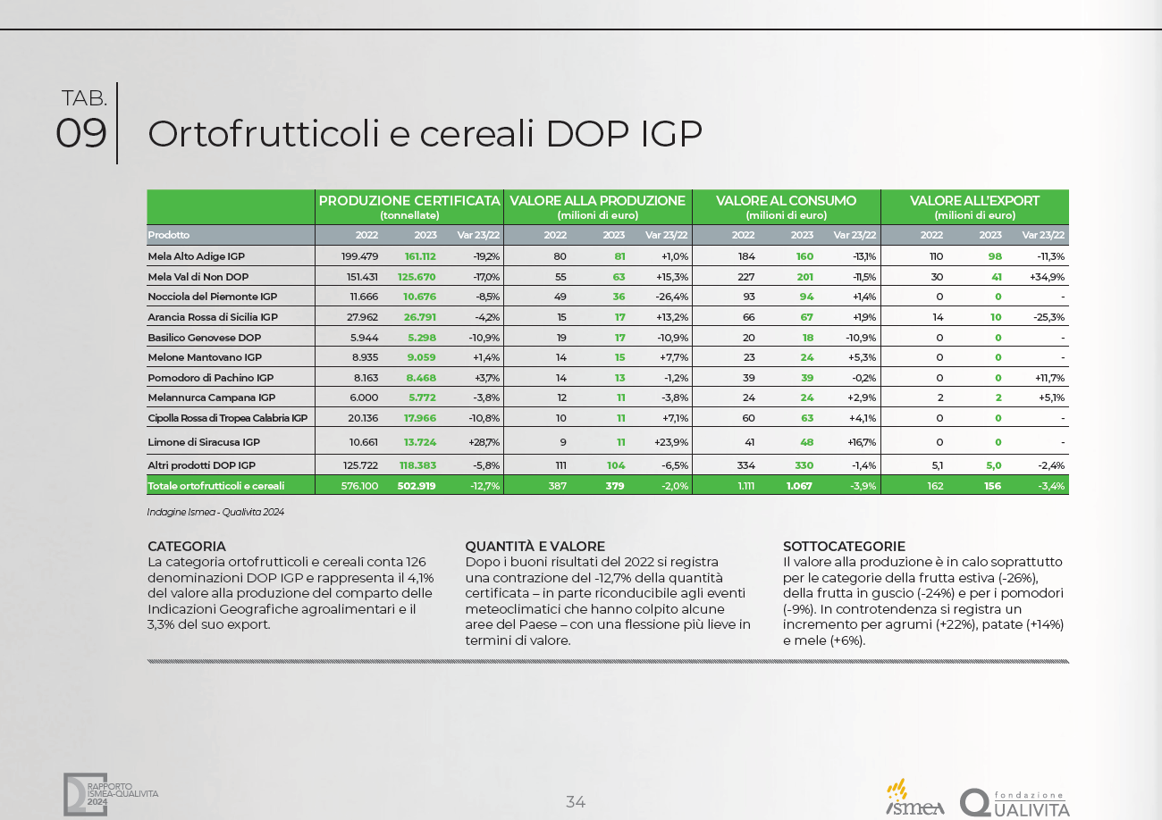 Guardando la classifica dei primi 15 prodotti alimentari, la triade Grana Padano DOP, Parmigiano Reggiano DOP e prosciutto di Parma DOP guida la carretta, e per trovare ortofrutta dobbiamo scorrere fino alla 14° e 15° posizione con le Mele dell’Alto Adige IGP – con 161 mila tonnellate e un valore generato di 81 milioni di euro – e la Mela Val Di Non DOP che conta 125 mila tonnellate certificate per un fatturato, alla produzione, di 63 milioni di euro.