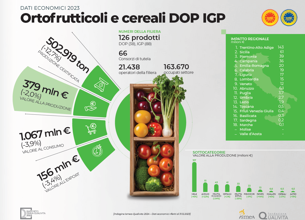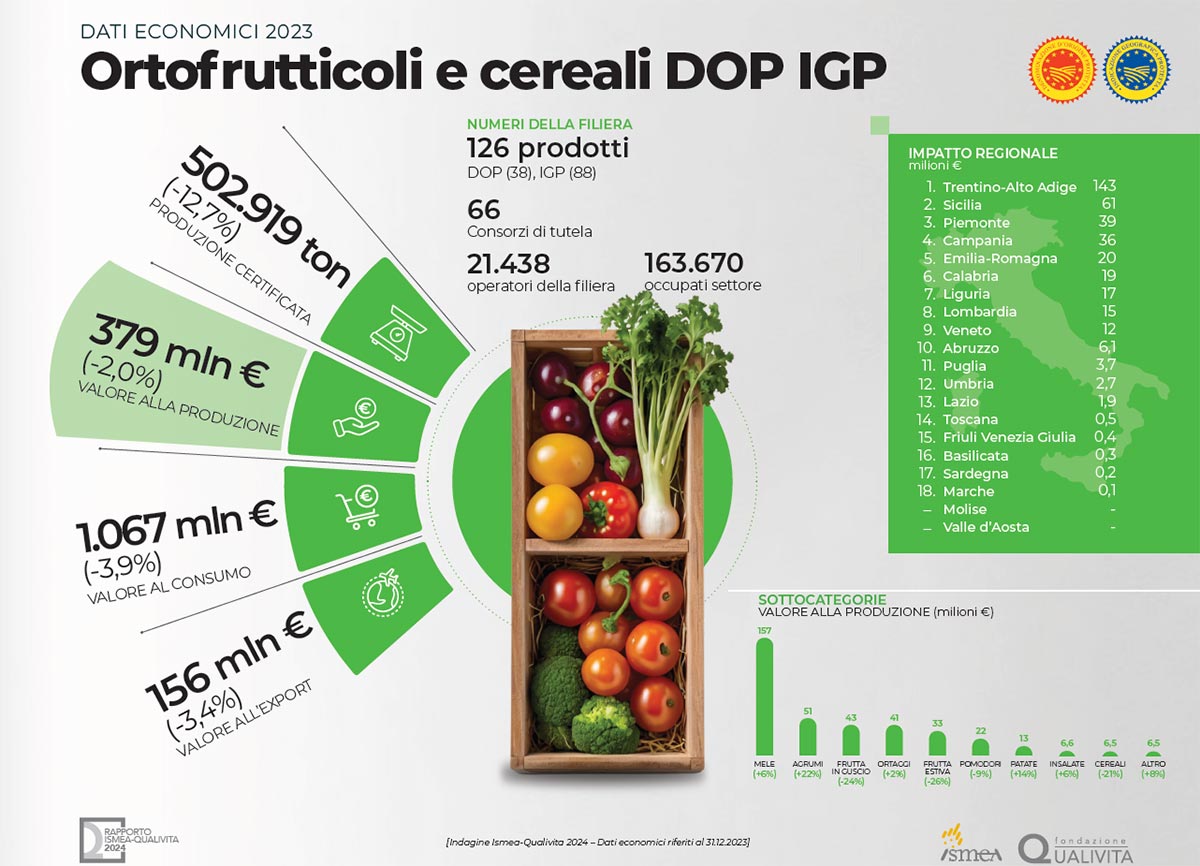 I restanti 111 prodotti DOP-IGP-STG hanno generato, nel 2023, appena 104 milioni di euro alla produzione, addirittura in calo del 6,5% se paragonato al 2022. Praticamente meno di 1 milione di euro a prodotto. “Peanuts”, direbbero gli anglosassoni per descrivere questa situazione, ed effettivamente si tratta di bruscolini quanto sviluppato dalla gran parte dei prodotti DOP-IGP-STG ortofrutticoli. D’altronde, su 126 prodotti solo 66 hanno un consorzio di tutela attivo, che è quella figura di raccordo fra la base produttiva e le istituzioni, che mette a terra tutte le attività come la promozione del prodotto. Difatti, gli altri 60 prodotti certificati senza consorzio di tutela, nella realtà dei fatti, è come se non esistessero.