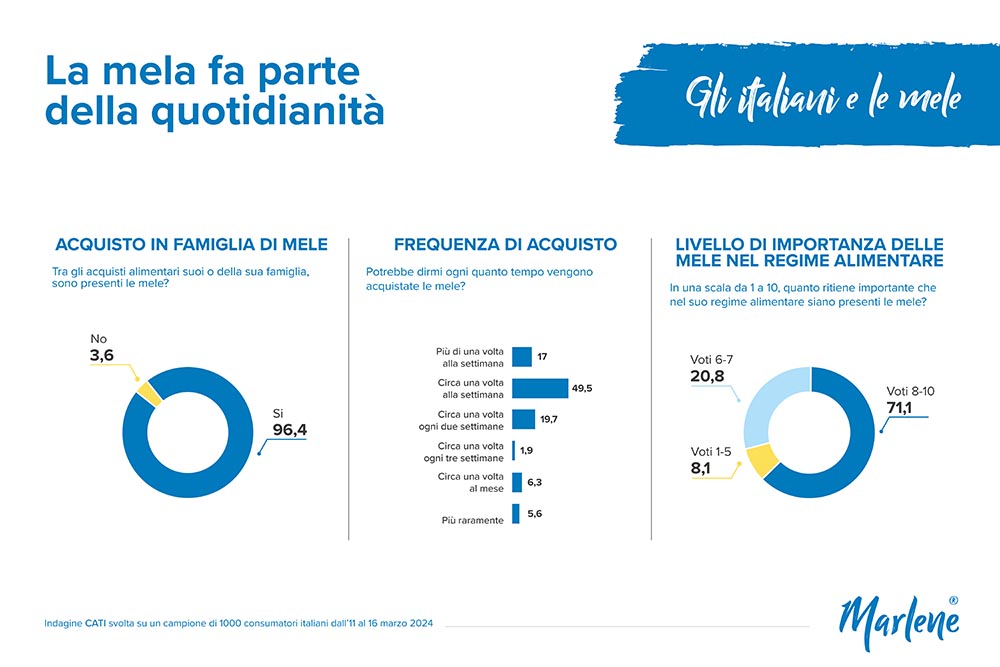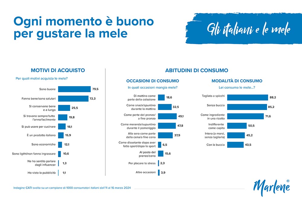 La mela accompagna le vite dei consumatori italiani, sempre più interessanti a esplorare i sapori e gli aromi delle diverse varietà, anche in cucina. È quanto emerge da due ricerche commissionate da Marlene®, su un totale di 1.500 persone dai 25 ai 65 anni. I risultati del sondaggio fotografano una realtà perfettamente in linea con la campagna della Figlia delle Alpi, che dalla Ruota degli Aromi al contest “Marlene®. Esperienza Culinaria 2.0” sta raccontando il mondo gourmet e la cultura del gusto che sta dietro una mela. Prima di tutto, è un frutto che fa parte della quotidianità: è tra gli acquisti del 96,4% dei nuclei familiari, di cui due terzi lo acquistano una o più volte a settimana. Ogni momento è buono per gustare una mela: viene consumata a colazione nel 19% dei casi, come spuntino alla mattina nel 32%, a fine pranzo nel 49%, come spuntino pomeridiano nel 48% e dopo cena nel 38% dei casi. Per il 16% degli intervistati può addirittura essere sostitutiva di un pasto.