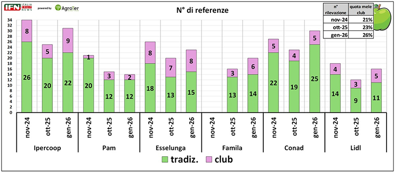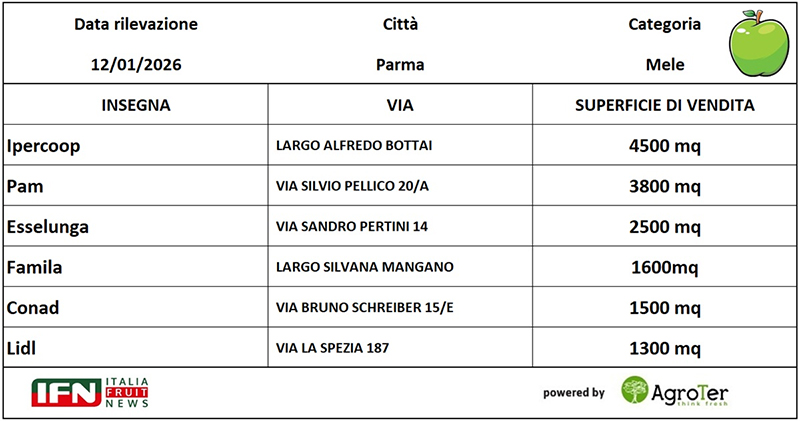 L’indagine ha coinvolto sei insegne della piazza di Parma, espressione di format e posizionamenti differenti: due ipermercati (Ipercoop e Pam), un superstore (Esselunga), due supermercati (Famila e Conad) e un discount (Lidl). I punti vendita sono stati rilevati in tre momenti – novembre 2024, ottobre 2025 e gennaio 2026 – costruendo un panel eterogeneo, letto su più stagioni, utile a mettere a fuoco l’evoluzione delle strategie di category management nella mela: dall’ampiezza e profondità di gamma alle logiche di valorizzazione a scaffale, fino ai cambiamenti che guidano l’assortimento nel tempo.