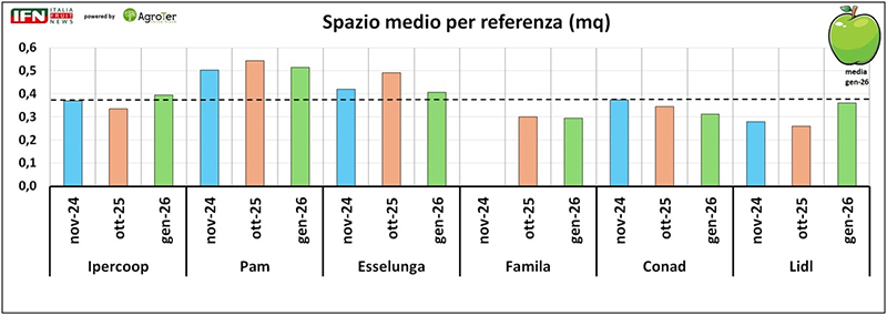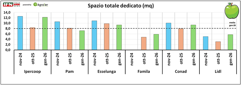 Anche l’analisi degli spazi complessivi dedicati alla categoria restituisce un quadro tutt’altro che uniforme. Ipercoop, coerentemente con la maggiore dimensione del punto vendita, è l’insegna che assegna la superficie più ampia allo scaffale mele, seguita da Esselunga. Pam, invece, nell’ultima rilevazione si colloca sotto la media: un dato che, per certi versi, sorprende se rapportato al format, e che la avvicina ai livelli più contenuti registrati da Famila e Lidl. In questi ultimi due casi la lettura è più lineare, perché si tratta dei negozi con le metrature complessivamente più ridotte. Diverso, invece, è il caso di Conad: pur avendo superfici non distanti da quelle di Famila e Lidl, destina alla mela uno spazio decisamente superiore, arrivando a superare un ipermercato come Pam e ad allinearsi ai livelli di Esselunga. Un’ulteriore conferma, quindi, di come la politica di insegna possa incidere in modo significativo, al di là della dimensione del punto vendita.
