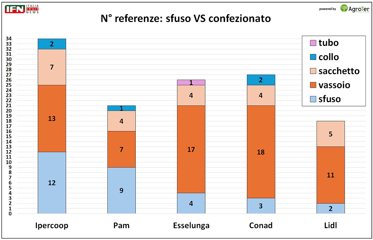Tra le confezioni, il vassoio domina, solitamente con quattro frutti, mentre il sacchetto, con frutti di calibro più piccolo e un posizionamento più economico, è sempre presente. La vendita a collo, invece, è raramente utilizzata e principalmente per promozioni spot. Unico caso di mela in tubo è Rockit, una referenza sempre meno comune sugli scaffali della Gdo. Naturalmente il prodotto sfuso non manca mai, generalmente dedicato alle pezzature più grandi nei negozi rilevati, per soddisfare i consumatori in cerca di frutti di maggiori dimensioni.