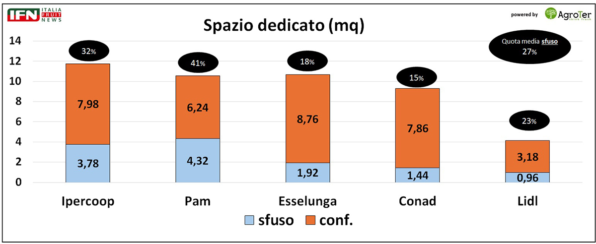 Per quanto riguarda gli spazi espositivi, la categoria delle mele si distingue per l’ampiezza, spesso superiore a quella dedicata ad altre categorie stagionali, come le clementine a ottobre o l’uva a settembre, che in media non superano i 6-8 metri quadrati complessivi, anche nei format più grandi. Questa abbondanza di spazio è favorita dalla bassa deperibilità delle mele, che spinge i responsabili di reparto a sovraesporre i prodotti per ridurre gli sfridi complessivi del reparto.
