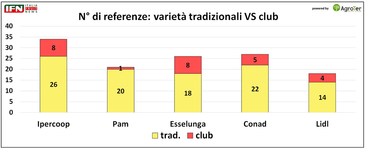 Abbiamo già accennato alla coesistenza tra varietà tradizionali, con la Golden che spicca, rappresentando circa la metà dei consumi nazionali, e le varietà club. Tuttavia, la presenza delle mele club risulta limitata e, in alcuni casi, quasi marginale (con una sola referenza). Inoltre, lo spazio dedicato per referenza è inferiore rispetto a quello delle mele classiche, nonostante le varietà club siano i prodotti più innovativi e, teoricamente, meriterebbero maggiore spinta commerciale.