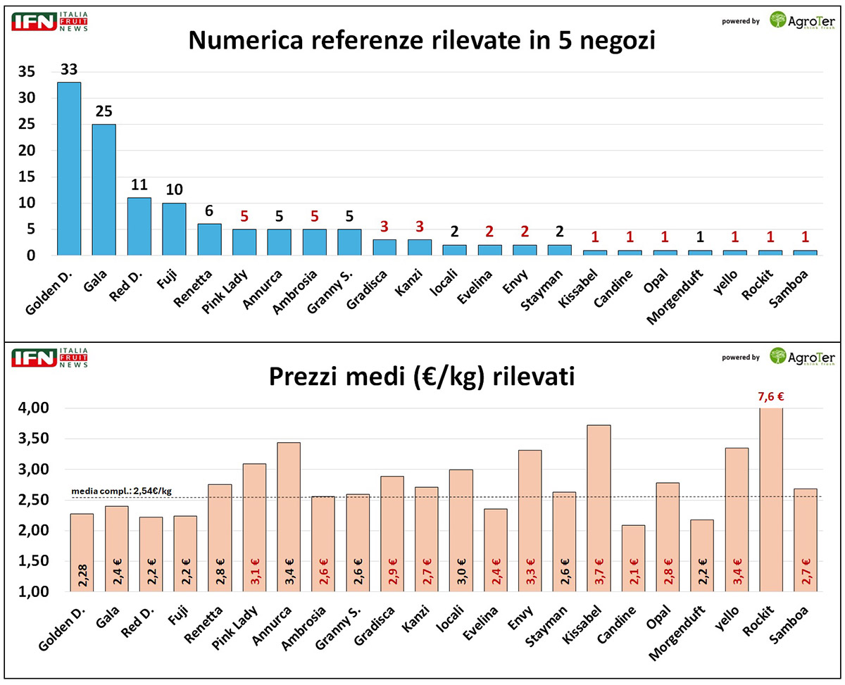 I prezzi medi rilevati superano nel complesso i 2,5 euro il chilo, con una tendenza al rialzo per le varietà club o le varietà tradizionali più di nicchia o ricercate, come Renetta, Annurca o le mele locali.